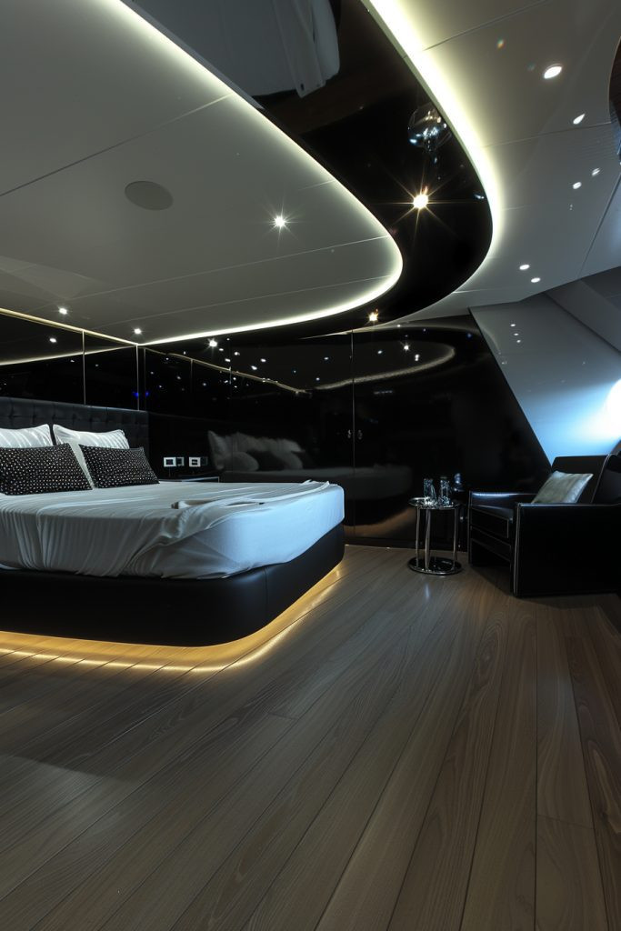 Step into the future with a bedroom where modern LED panels and sleek, minimalist design pave the way for a cutting-edge living space. This design is perfect for the tech-savvy baddie who loves innovative and contemporary aesthetics. Imagine a minimalist platform bed with clean lines, its headboard wall covered in futuristic, color-changing LED panels that can be adjusted to suit any mood. The room features high-tech, handleless furniture and sleek surfaces, creating a sense of sophistication and forward-thinking design. This is a space that is both cool, controlled, and endlessly customizable.