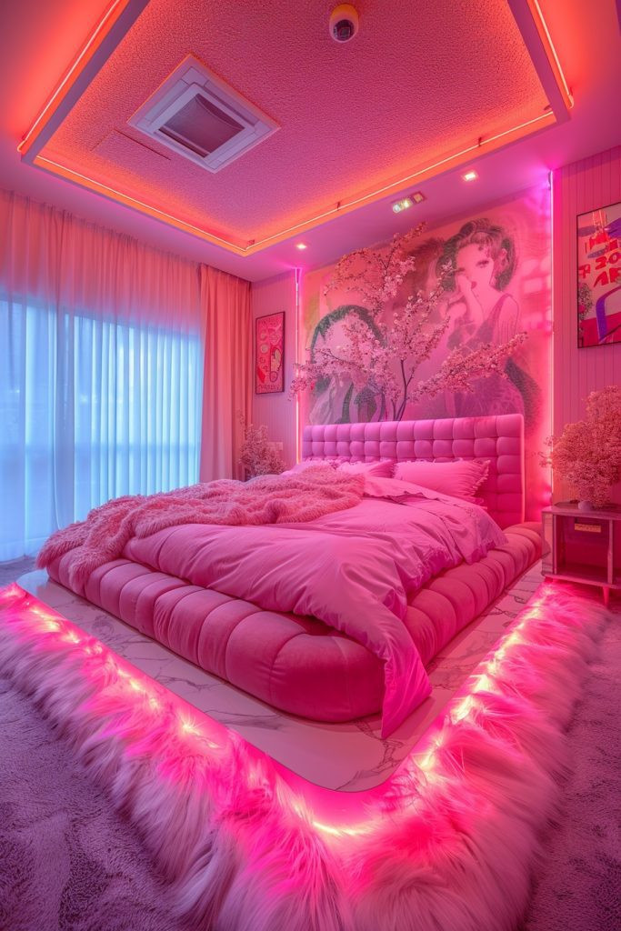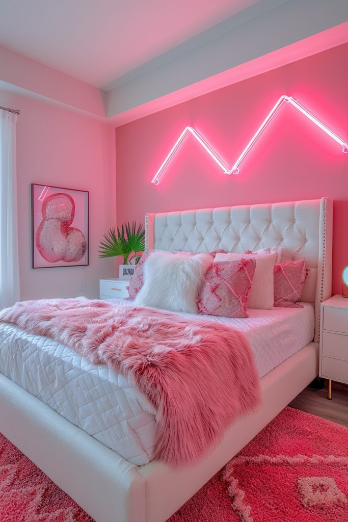 9. Bold Blush Baddie Bedroom with Neon Glow
