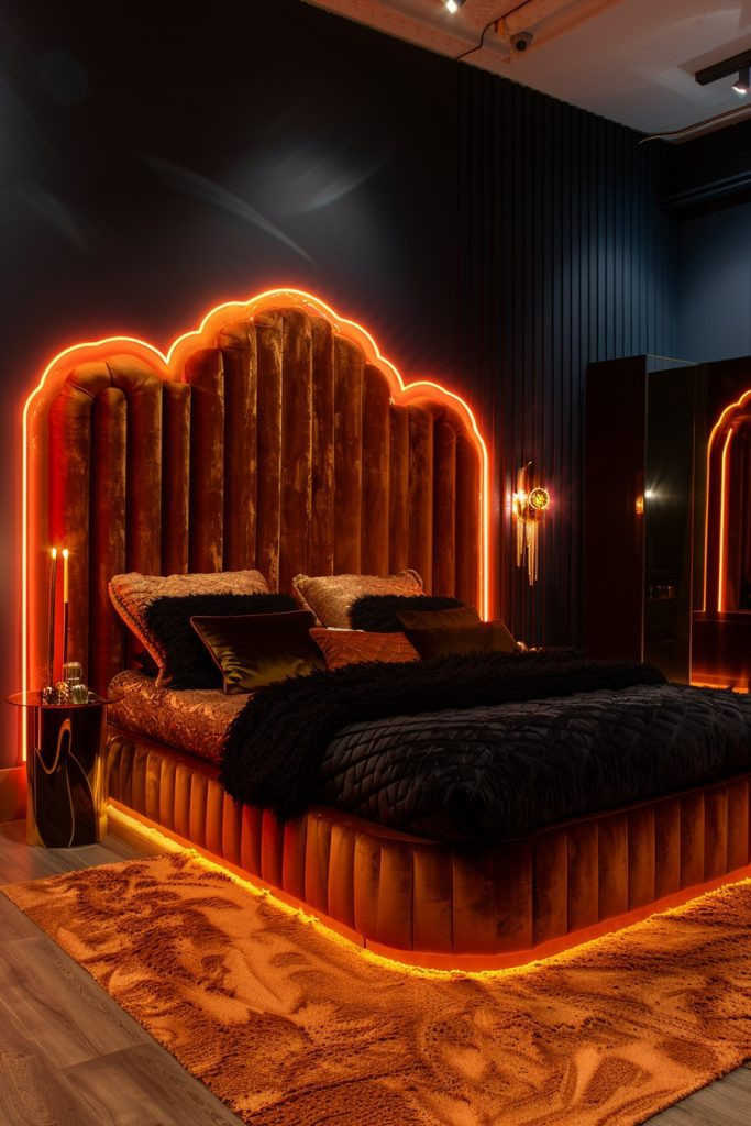 Combine the lush, tactile appeal of velvet with vibrant, colorful lights to create a cozy and captivating environment. This design is perfect for those who love a mix of touchable luxury and modern flair. A plush velvet bed in a rich jewel tone is the centerpiece, accented by vibrant LED or neon lights that can change color to suit the mood. The room is adorned with elegant furniture and decor, like gold-framed mirrors and plush rugs, that enhance the overall luxurious feel, creating a space that is both cozy and stylishly dynamic.