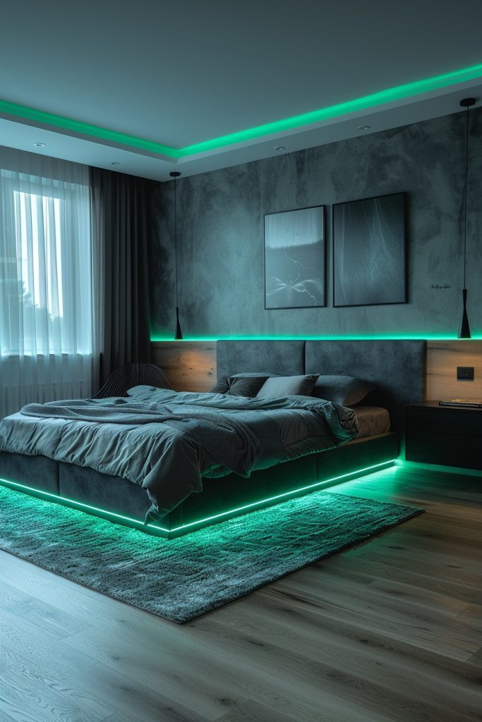 Showcase sleek, contemporary designs enhanced by innovative edge lighting for a modern and refined aesthetic. This design is for those who love a clean, architectural look with a bold twist. A sleek, minimalist bed is accented by edge lighting integrated into the headboard or a feature wall, creating a sharp, glowing outline. The room features chic, handleless furniture and a neutral color palette, creating a sense of calm and refinement. The edge lighting enhances the room’s clean lines, making the space feel both stylishly futuristic and inviting.