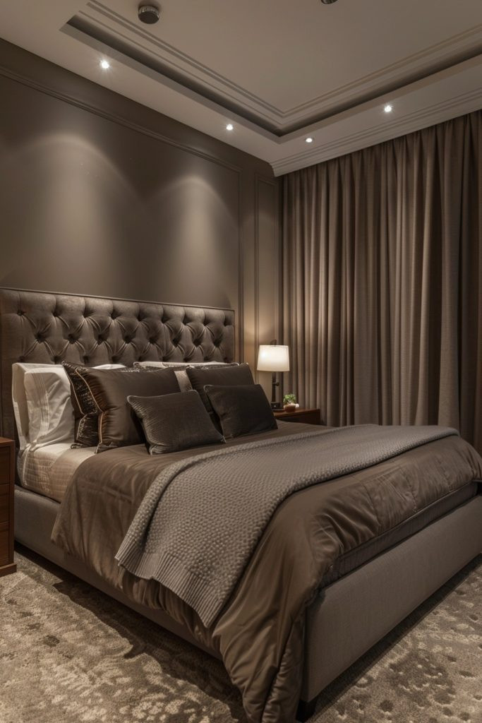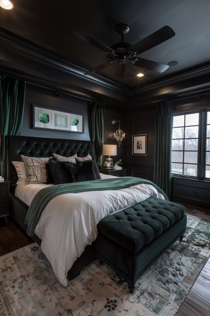 A moody color palette bedroom uses deep, rich, saturated colors like navy, emerald, charcoal, or even black to create a dramatic and deeply intimate atmosphere. This style is perfect for couples who enjoy a more somber, sophisticated, and cozy aesthetic. The use of luxurious textures like velvet and leather, paired with soft, warm, and dimmable lighting, enhances the room’s moody feel, making it a perfect, cocoon-like romantic retreat.