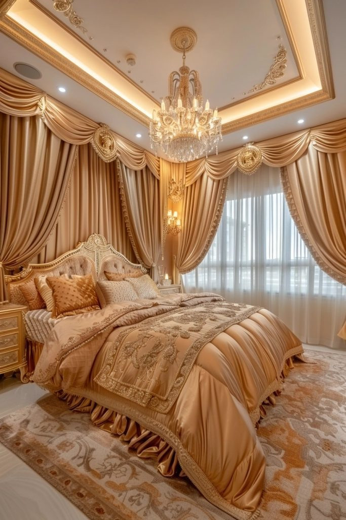 Opulent Baroque bedrooms are rich in decorative detail and luxurious materials, perfect for couples who love a sense of grandeur and extravagance. This style features ornate, heavily carved furniture, rich fabrics like brocade and damask, and dramatic color schemes that evoke the opulence of the Baroque period. Gilded mirrors, elaborate draperies, and plush carpets are common, creating a regal and lavish atmosphere that feels like stepping back in time.