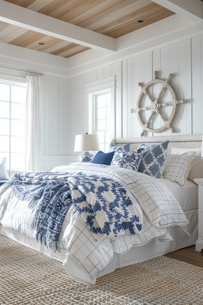 Nautical theme bedrooms evoke the tranquility and expansiveness of the sea, making them ideal for couples who love maritime culture. This style typically uses a crisp palette of blues and whites, complemented by wood accents and maritime motifs like anchors, ropes, and ship wheels. The design often incorporates stripes and an abundance of natural light, enhancing the fresh, nautical feel. It’s perfect for those who want to bring a bit of the calm and adventure of the ocean into their home.