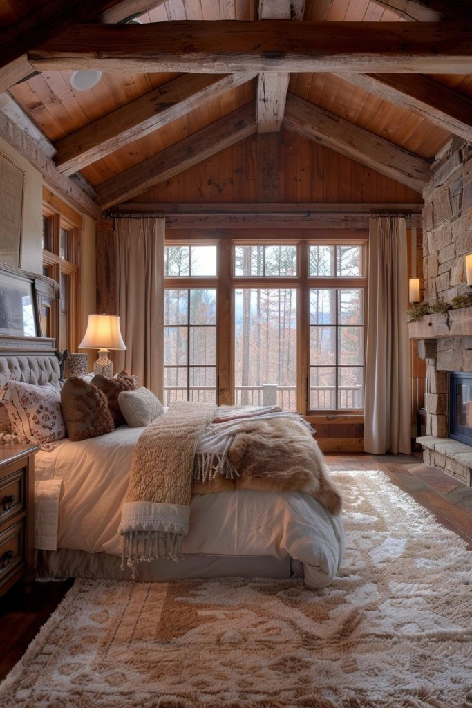 Rustic romance bedrooms blend the warmth and authenticity of rustic elements with the charm of soft, romantic details. Natural wood beams, a stone fireplace, and a palette of warm, earthy tones create a cozy and incredibly inviting atmosphere. This style often includes soft, flowy fabrics, fresh flowers, and quaint decorative elements, making it ideal for couples who appreciate the beauty of the rustic outdoors combined with intimate, romantic touches.