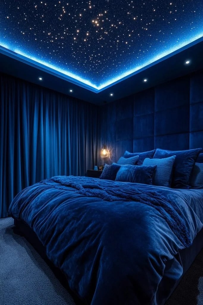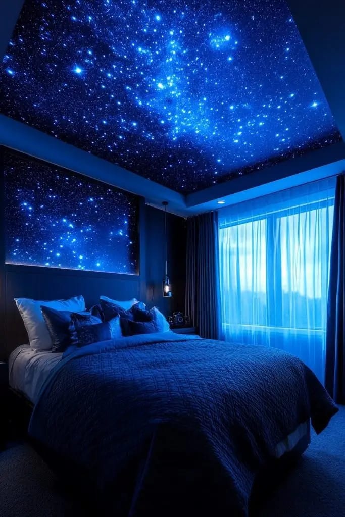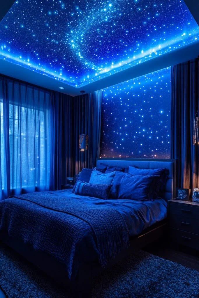 The Midnight Blue Starry Night theme creates a celestial atmosphere using deep blue tones and twinkling star-like lights, perfect for blue fantasy bedroom ideas. It promotes a tranquil and mysterious vibe, reminiscent of looking into the vast night sky. Incorporating elements like a planetarium-style projector or glow-in-the-dark ceiling decals enhances the cosmic experience. This theme is ideal for those who dream of outer space and astral adventures, offering a peaceful, immersive retreat.