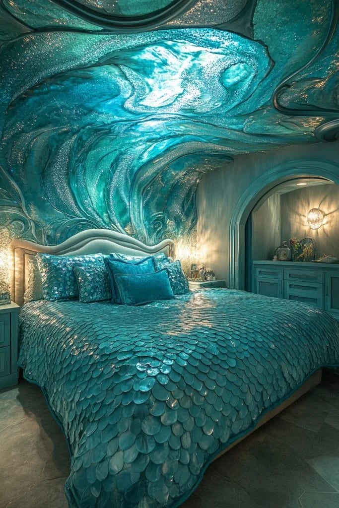 The Aquatic Blue Mermaid’s Cove theme immerses you in a fantastical underwater world, using aqua and teal blues to simulate ocean depths. This blue fantasy bedroom idea includes mermaid and sea creature decor, with shimmering fabrics and iridescent accents mimicking water. Soft, flowing drapes and wave-like patterns can enhance the undersea fantasy. This theme is ideal for those who are fascinated by the ocean’s mysterious beauty and dream of life beneath the waves.