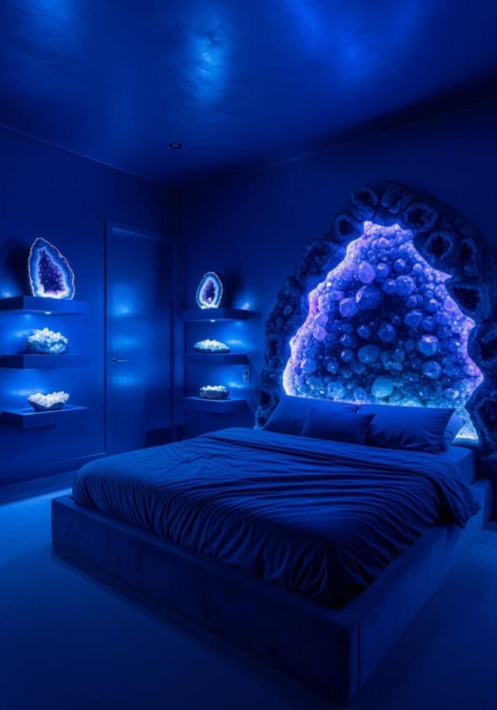 For a truly magical and immersive blue fantasy experience, imagine a bedroom designed as a glowing crystal grotto. The walls are painted a deep, rich sapphire blue with subtle iridescent or glitter accents to mimic a cave. The focal point is a large, custom-built headboard made to look like a cluster of glowing blue and purple crystals, perhaps with integrated LED lighting that emits a soft, otherworldly light. Smaller crystal clusters and geode slices are placed on floating shelves, illuminated by hidden blue LED strips. The bedding is plush and dark blue, creating a cozy and enchanting hideaway.
