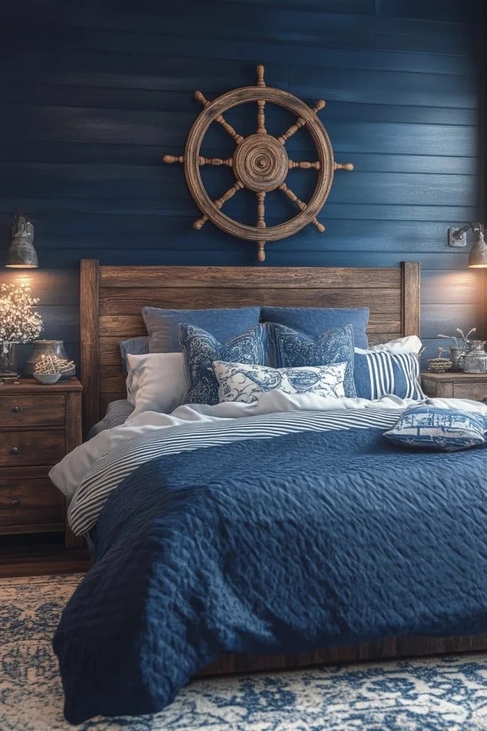 The Nautical Navy Navigator’s Room theme uses dark navy tones combined with maritime elements to create a sophisticated seafaring environment. This blue fantasy bedroom idea incorporates naval decor, such as anchors, ship wheels, and striped textiles, to evoke the spirit of ocean exploration. Brass fixtures and rugged wooden furniture can add an authentic touch. This theme is ideal for those who are drawn to the sea or have a spirit of adventure.