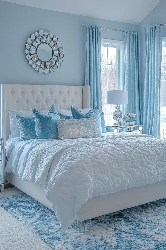 The Arctic Blue Winter Wonderland theme utilizes pale blues and whites to create a frosty, snow-covered look. This blue fantasy bedroom idea is perfect for those who love the crisp, clean feel of winter mornings. Snowflake patterns and shimmering fabrics mimic the sparkle of fresh snow. Plush rugs and soft, warm bedding ensure the room remains cozy and inviting, despite the cool color palette, making it a comfortable winter escape.
