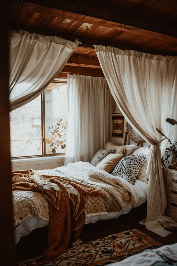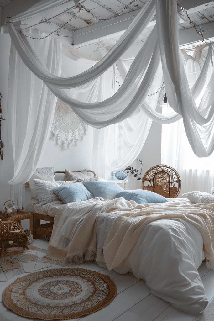 Create a dramatic and cozy “canopy of comfort” in your high-ceilinged bedroom. You can do this by suspending a large hoop from the ceiling over your bed and draping long panels of sheer, flowing fabric from it to the floor. This creates the intimate, enclosed feeling of a canopy bed without the need for a four-poster frame, and it beautifully utilizes the vertical space, creating a soft, romantic, and cozy sanctuary.