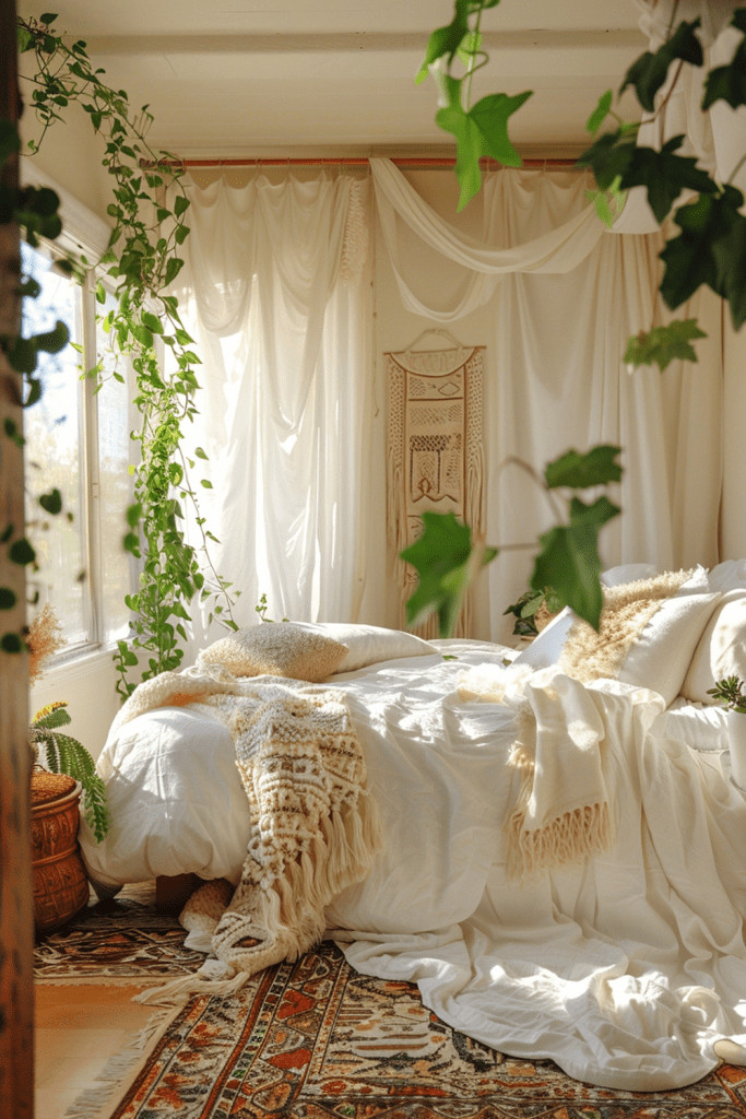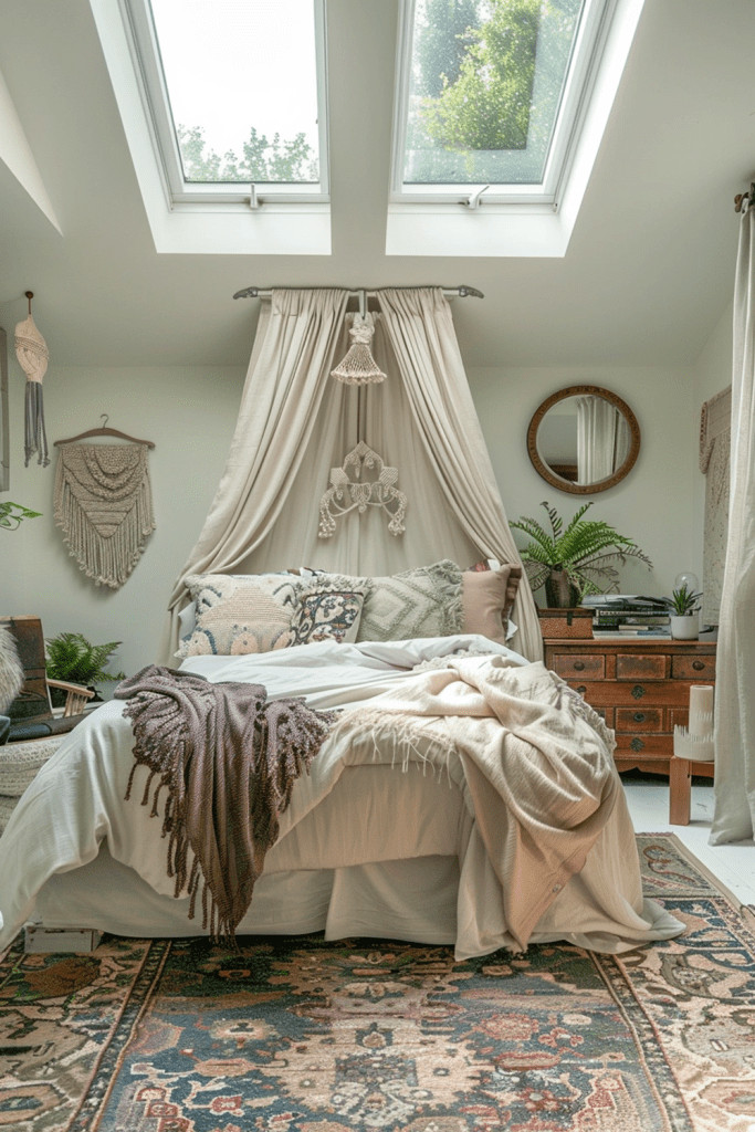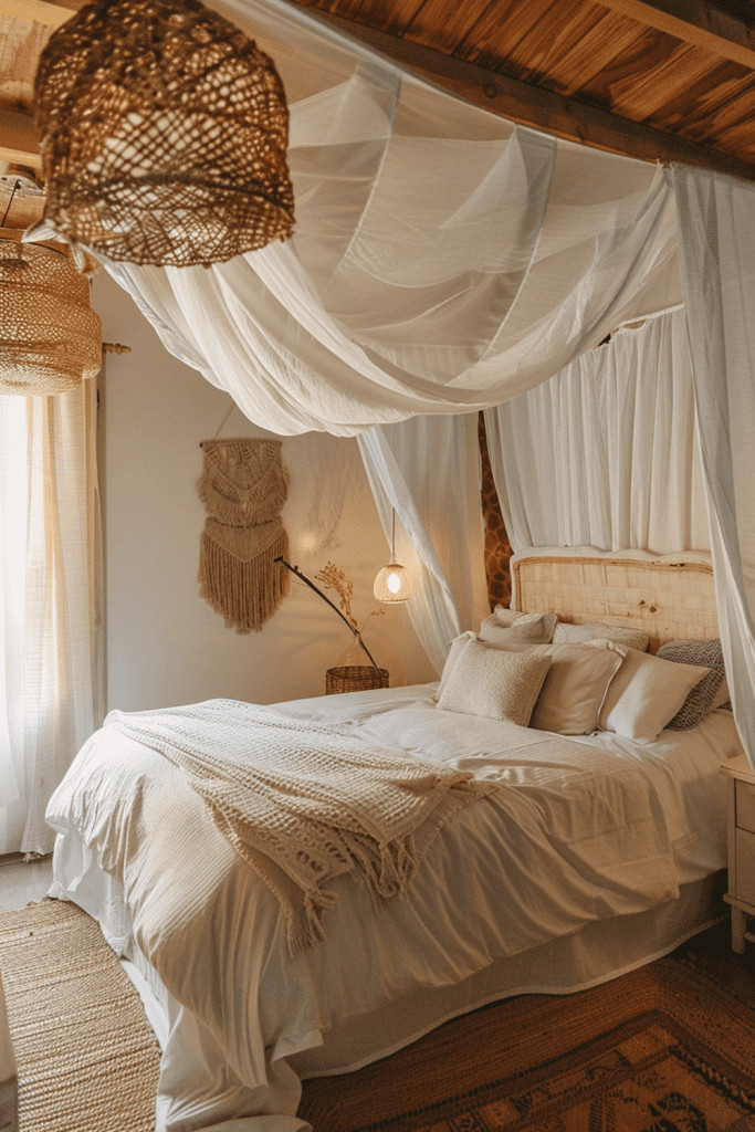 Create an ethereal, dreamy escape in your boho bedroom by using the tall ceilings to your advantage. Hang long, delicate, and lightweight textiles from the ceiling, allowing them to drape and flow throughout the upper part of the room. This can create a soft, cloud-like effect that makes the space feel serene, magical, and incredibly blissful. It’s a perfect way to soften a large, tall space and make it feel more intimate.