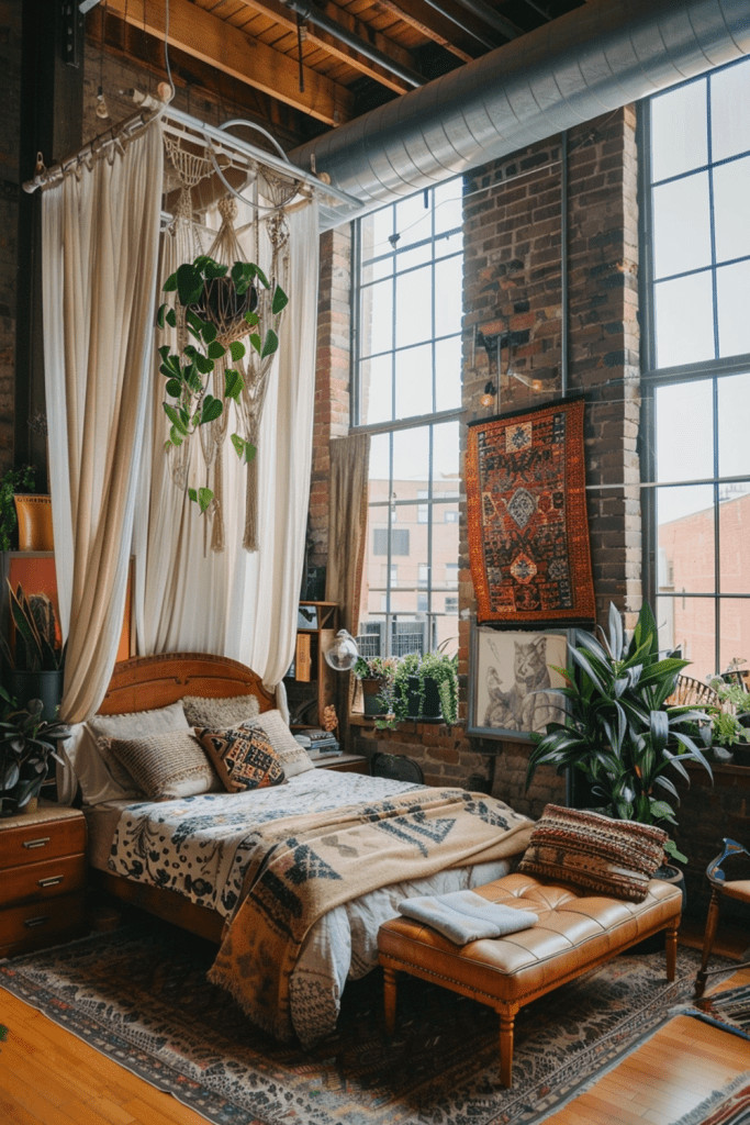 Embrace the true art of loft living with a boho bedroom that is open, airy, and full of personality. A high-ceilinged space is the perfect canvas for a loft layout. The bedroom area might be on one level, with a cozy living or working space below, all within one open room. The key is to use rugs and furniture to define the different “zones” while maintaining the open, expansive feel that makes loft living so desirable.