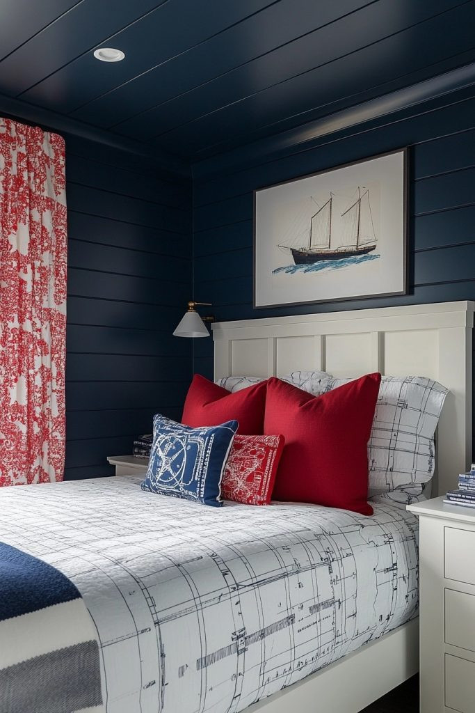 Harbor Haven Bedroom blends traditional maritime elements with a modern aesthetic, creating a unique coast chic bedroom. Navy and white dominate the color scheme, accented with red for a classic nautical look. Model ships, anchor motifs, and rope details provide thematic decor, while contemporary furniture ensures the space feels current and fresh. This bedroom is ideal for those who appreciate the heritage of maritime design but desire a modern twist.