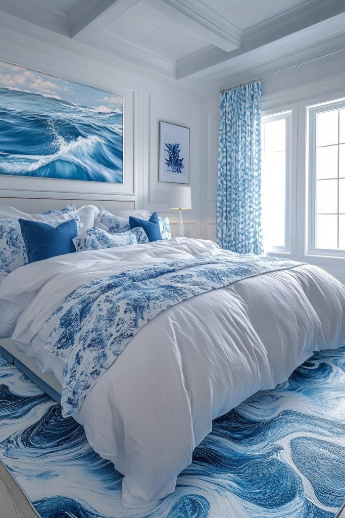 A Deep Blue Dreamer’s Den draws its inspiration from the deepest parts of the ocean, using rich, dark blue tones to create a dramatic and moody atmosphere. Plush bedding and heavy drapes ensure a luxurious feel, while accents like silvered coral sculptures and deep-sea artwork add mystique and depth. The use of reflective surfaces and strategic lighting mimics the shimmer of water, enhancing the underwater illusion. This bedroom is perfect for those who dream of the mysterious ocean depths.