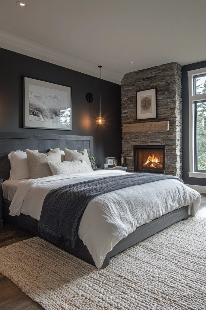 Coastal Cliffs Bedroom captures the dramatic and rugged beauty of coastal cliffs, using a color palette of stormy grays and deep ocean blues. The room should be designed with a focus on natural textures, incorporating stone, wood, and linen. A dramatic headboard, perhaps made from reclaimed wood or designed to mimic the stratification of rock, can serve as the room’s centerpiece. Subtle lighting, such as wall sconces with a soft, diffuse glow, creates a moody atmosphere reminiscent of overcast seaside days.