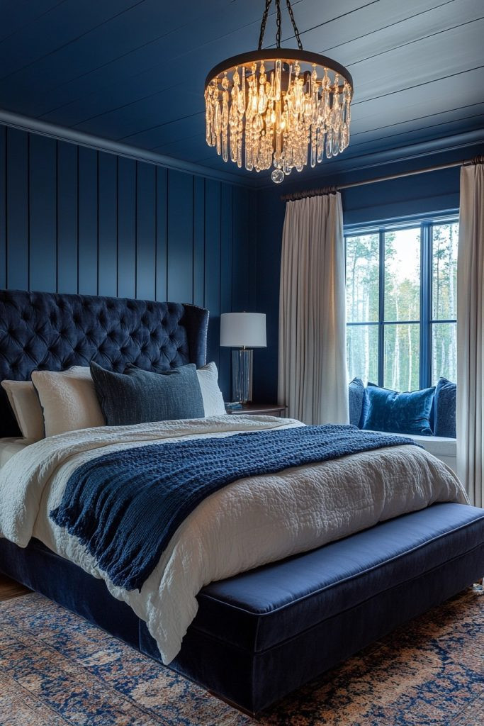 High Tide Bedroom is all about capturing the dynamic energy of the high tide, using deep blues and foamy whites in its color palette. The bed should be the centerpiece, with a dramatic upholstered headboard in navy blue velvet, set against a wall of white vertical shiplap for contrast. Luxurious bedding in layers of blue, gray, and white mimics the layers of the ocean, providing depth and interest. Silver accents in lamp bases and drawer pulls add a touch of sparkle, like sunlight on water.
