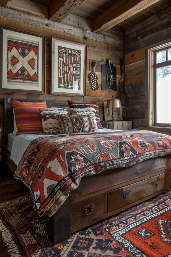 For a more adventurous and spirited take on the theme, Wild West Boho combines the ruggedness of Western decor with the eclectic, global vibe of bohemian style. This look is perfect for rustic boho bedrooms with a bold personality. Use elements like a faux cowhide rug, furniture with leather details, and rough-hewn wood. Complement these rustic pieces with vibrant, patterned textiles, perhaps with Southwestern or Native American-inspired motifs, and a collection of global accents. This style is for those who appreciate bold statements and have a wandering spirit.