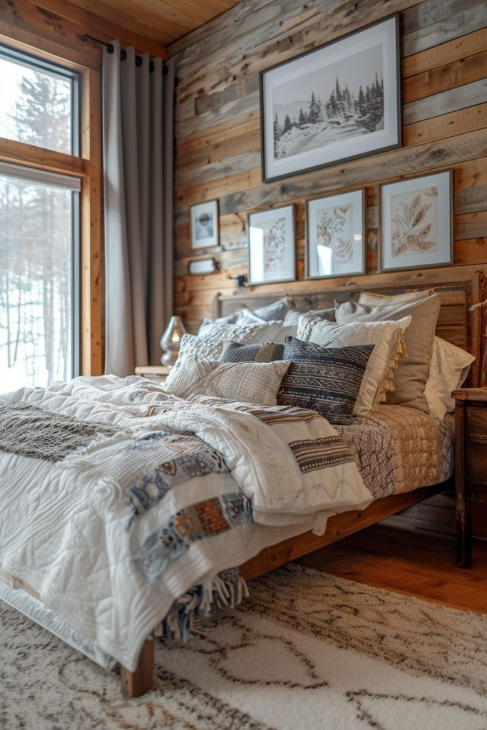 The Cabin Comfort style focuses on creating a cozy, informal retreat that effortlessly combines rustic woods with a relaxed bohemian mix of textures and patterns. This look is perfect for those seeking a laid-back, comfortable space that invites relaxation and ease. Think of a simple wooden bed frame, perhaps dressed in flannel sheets, and a comfortable leather armchair in the corner. This rustic base blends seamlessly with bohemian elements like a macramé wall hanging or a collection of colorful, patterned throw pillows.