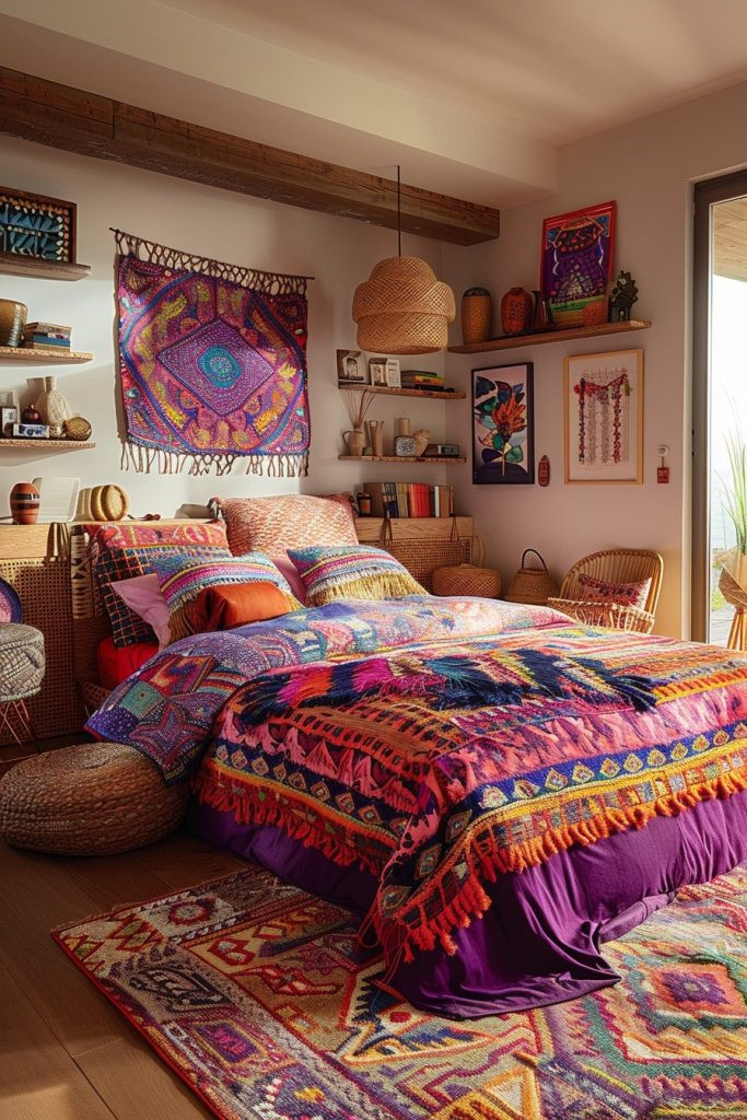 Quilted Quarters focuses on the comfort, tradition, and artistry of quilted fabrics. Use handmade quilts as bedcovers, as dramatic wall hangings, or even as unique drapes to add warmth, color, and pattern to the room. This style combines the homespun, nostalgic charm of quilting with the eclectic, layered mix of bohemian decor. It’s perfect for creating a cozy, inviting, and deeply personal bedroom retreat that feels like a warm hug.
