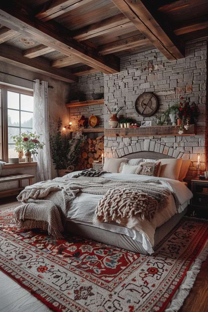 A Mountain Retreat bedroom captures the essence of high-altitude tranquility with elements that reflect a cozy, alpine aesthetic. Use heavy timber furniture, a stone fireplace surround, and an abundance of warm, layered fabrics to create a safe and cozy haven. This style works wonderfully with chunky knit blankets, faux fur throws, and plaid patterns, adding a touch of luxury to the ruggedness. Ideal for lodges, cabin homes, or anyone wanting to create that feel, this decor invites deep relaxation and quiet contemplation.