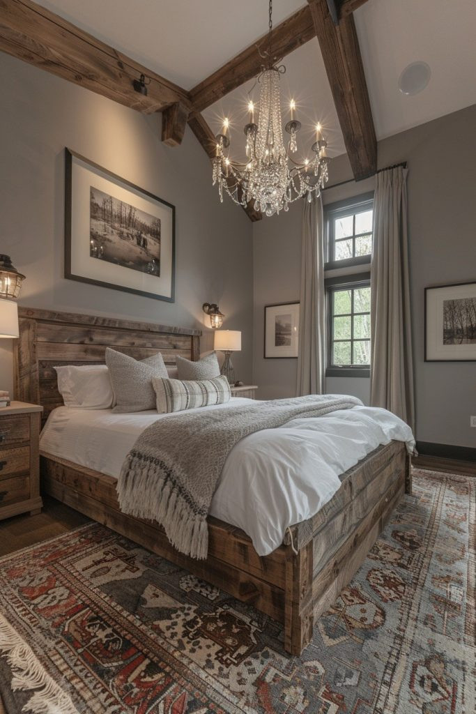 Rugged and Refined is a style that expertly blends the rough, natural textures of rustic decor with the sleek, clean lines of modern design. Think of a raw, live-edge wood headboard paired with smooth, minimalist metal bedside lamps. Or a rough, nubby linen throw blanket juxtaposed with a sleek leather armchair. This style is perfect for those who appreciate a bedroom that beautifully balances raw, untamed natural beauty with sophisticated, contemporary design elements.