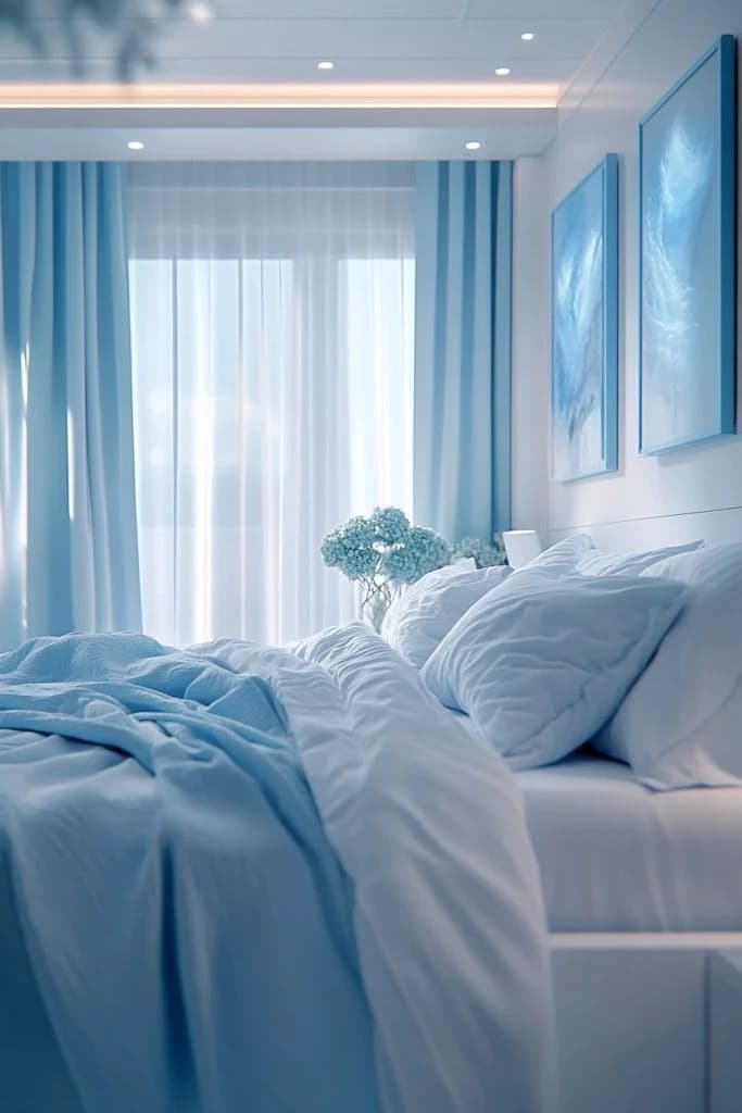 Azure Escape utilizes vibrant azure blue accents against a backdrop of neutral tones for a striking contrast. In this cozy bedroom blue design, bold patterns in throw pillows or an area rug can add visual interest and depth. Contemporary art pieces featuring abstract designs in similar hues can tie the room together. The overall effect is both energizing and soothing, perfect for a modern aesthetic that feels both fresh and calming.
