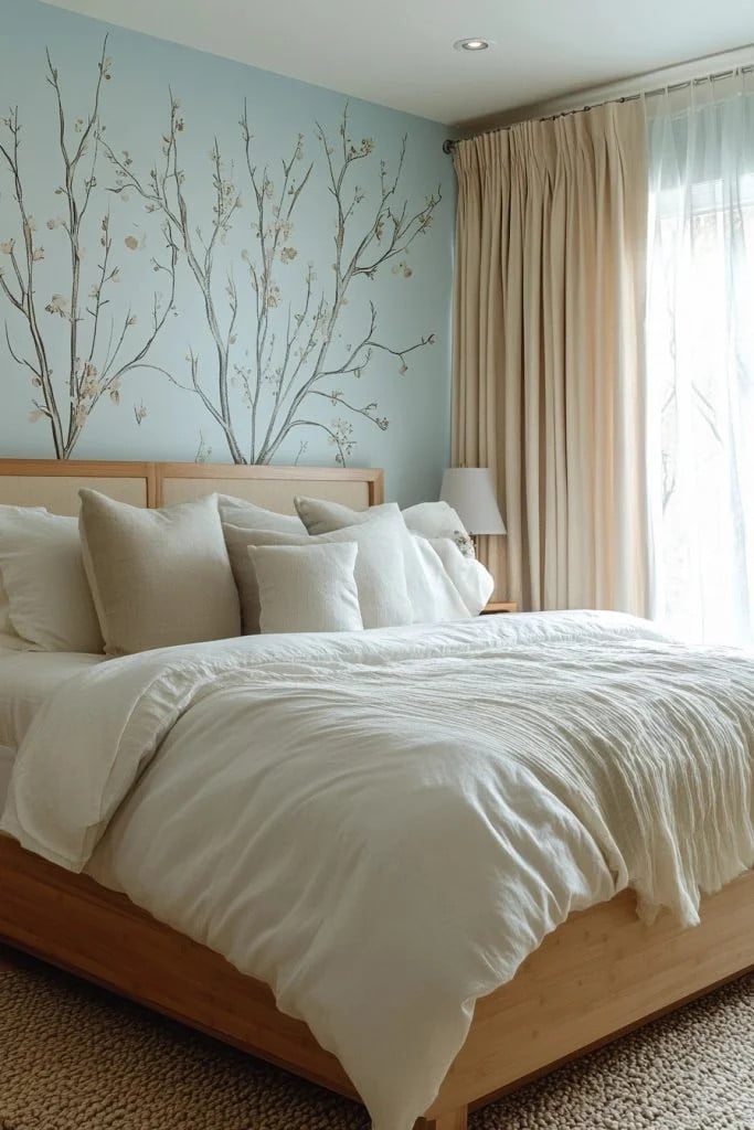 Misty Morning Blues features soft, muted blues that evoke the tranquility of an early morning mist. This cozy bedroom blue design incorporates layers of light fabrics, such as cotton and linen, to enhance the airy, ethereal atmosphere. Subtle patterns, like stripes or botanical prints, add interest without overwhelming the gentle color scheme. Ambient lighting should be soft and soothing, perfect for peaceful mornings.