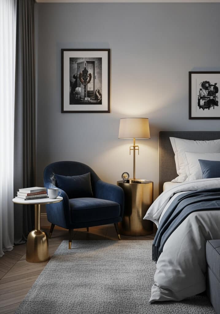 For an instant injection of coziness and sophistication, create a dedicated blue velvet reading nook in your bedroom. This involves a plush, comfortable armchair upholstered in a rich, deep blue velvet, positioned in a quiet corner. Next to it, place a small, round side table in a warm metallic like brass or a dark wood. A soft, warm-toned floor lamp provides perfect reading light, and a stack of books invites you to relax. This nook becomes a luxurious, inviting escape within your bedroom, perfect for unwinding.