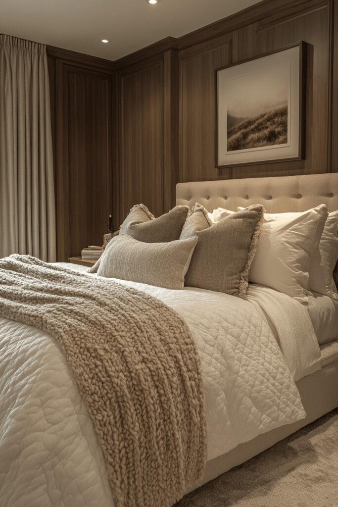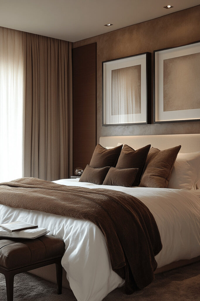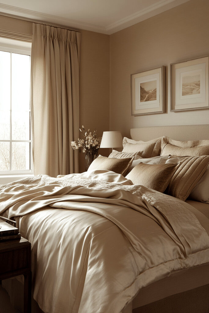 Bring a soft, understated elegance to your bedroom with gentle fawn shades. This warm, light-brown hue is perfect for creating a cozy atmosphere that encourages deep relaxation. Make the space even more inviting with plush textiles, like a fawn-colored velvet armchair or soft, comfortable bedding. The room’s layout should be designed to maximize comfort, turning your bedroom into a gentle and stylish domain for rest.