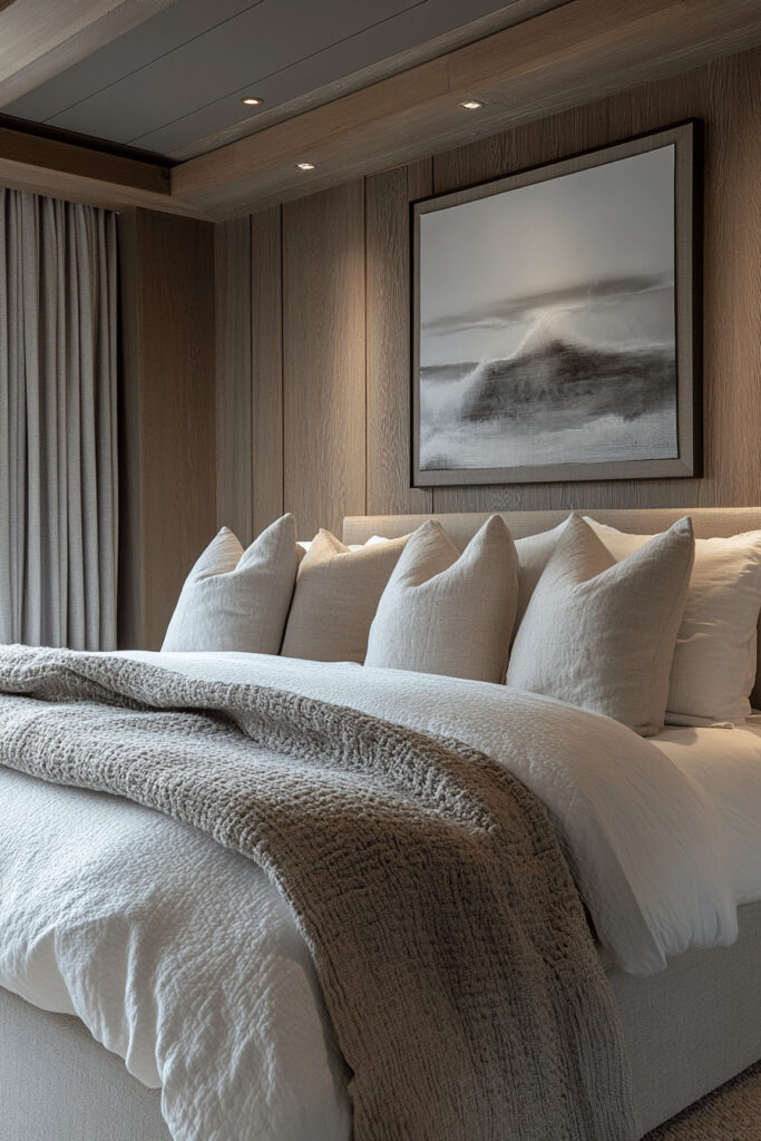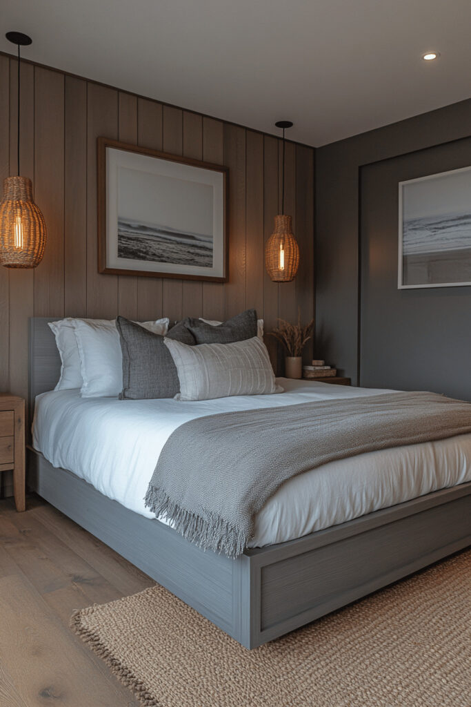 Use a range of subdued pebble tones, from light gray to deep greige, to create a soothing and harmonious bedroom. This natural color scheme is beautifully complemented by organic materials like warm wood furniture and soft linen curtains, enhancing the connection to nature. Keep art and decor minimal to maintain a feeling of open, tranquil space. Soft, diffused lighting ensures the room feels welcoming and restful at any time of day.