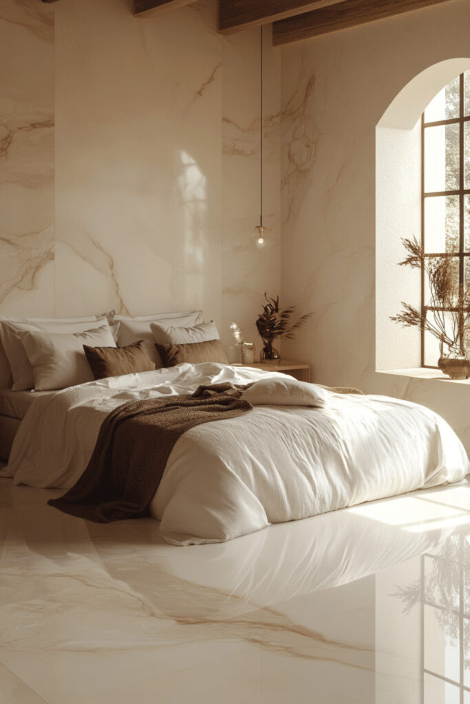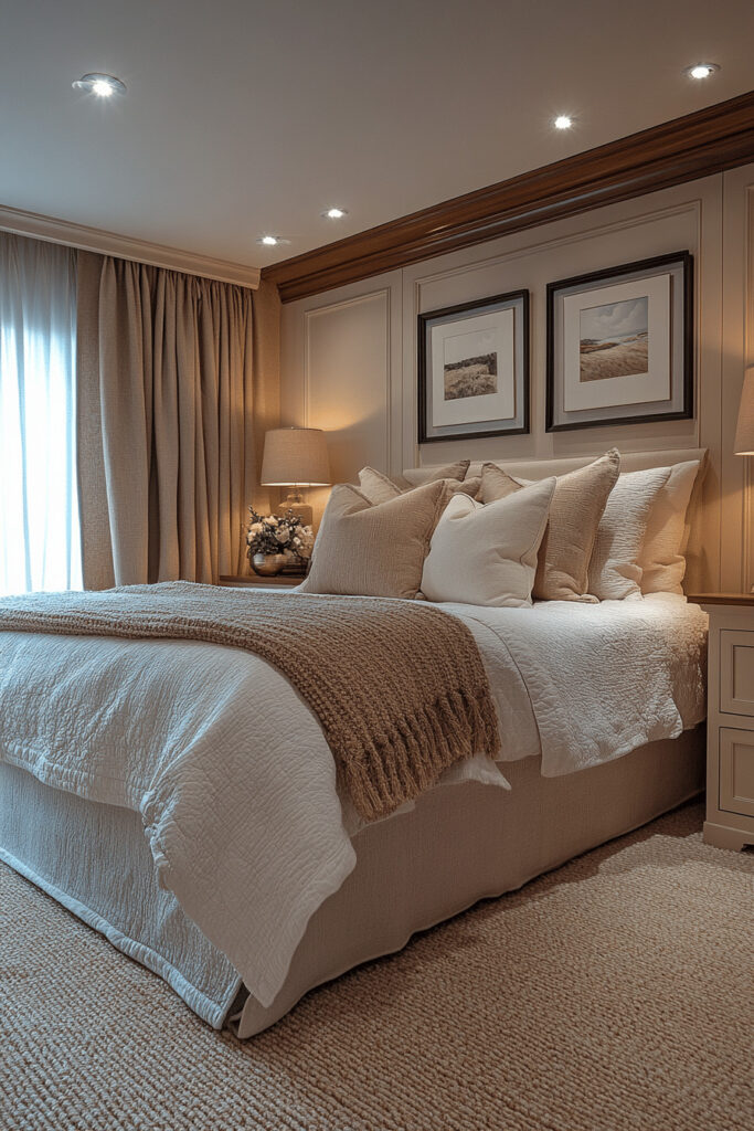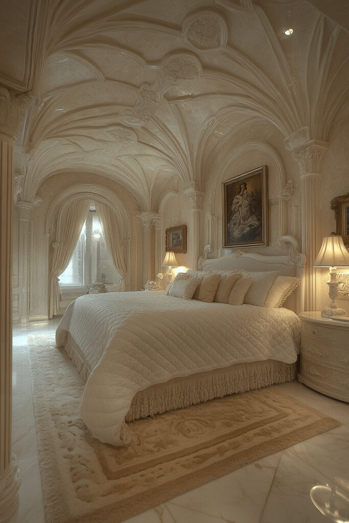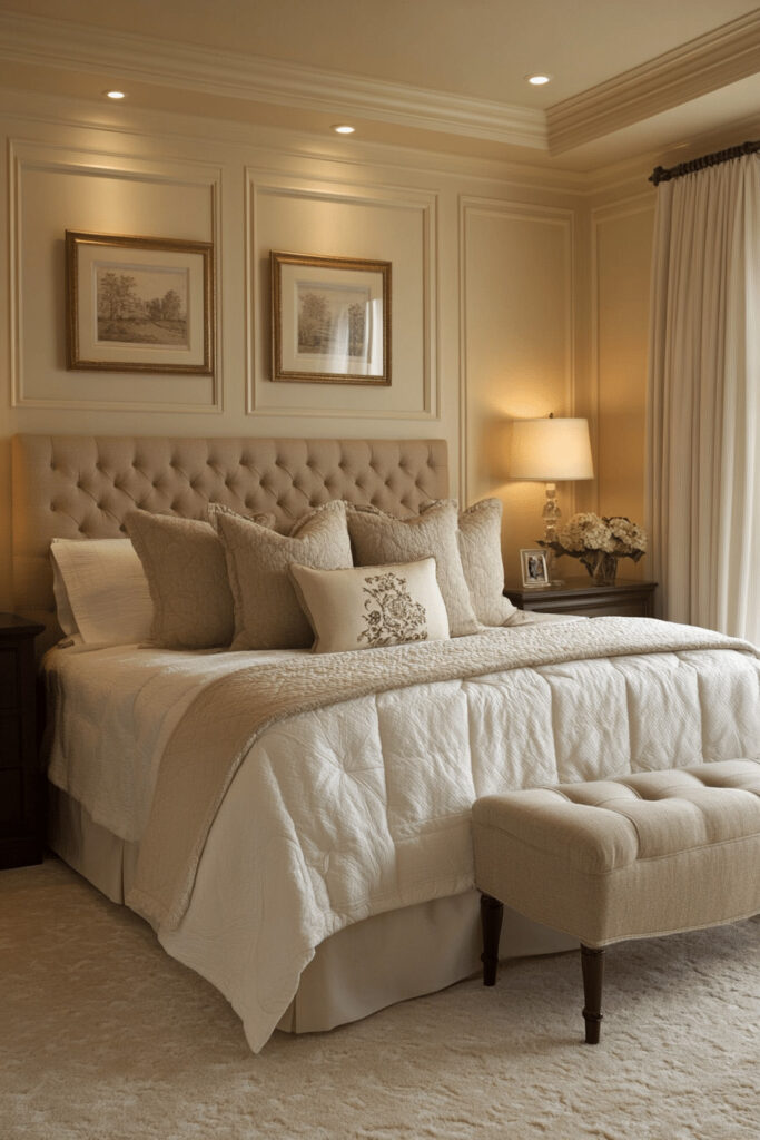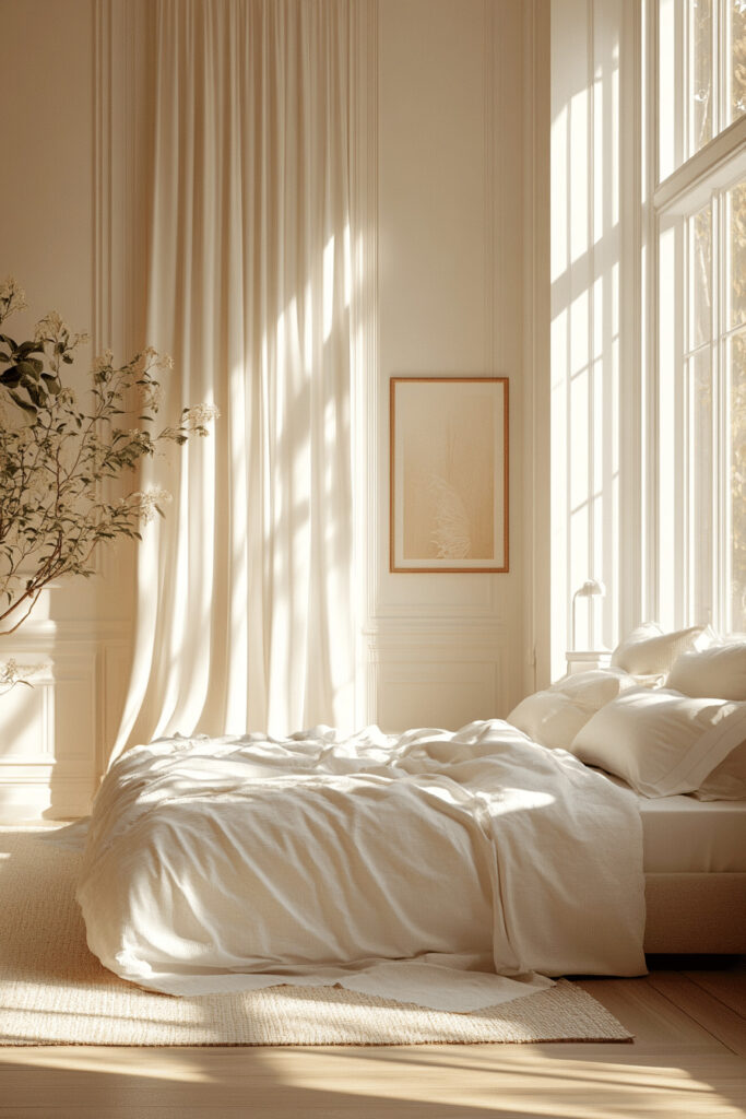 For those seeking a sanctuary with a touch of softness and light, a creamy color palette is perfect. The off-white, creamy tones on the walls and bedding create a smooth, comforting look that instantly soothes the senses. This design invites you to relax with plush cushions, soft throws, and an overall feeling of gentle warmth. Simple, elegant furniture in light wood or white complements the room’s calm aesthetic without creating harsh lines, resulting in a truly peaceful haven.