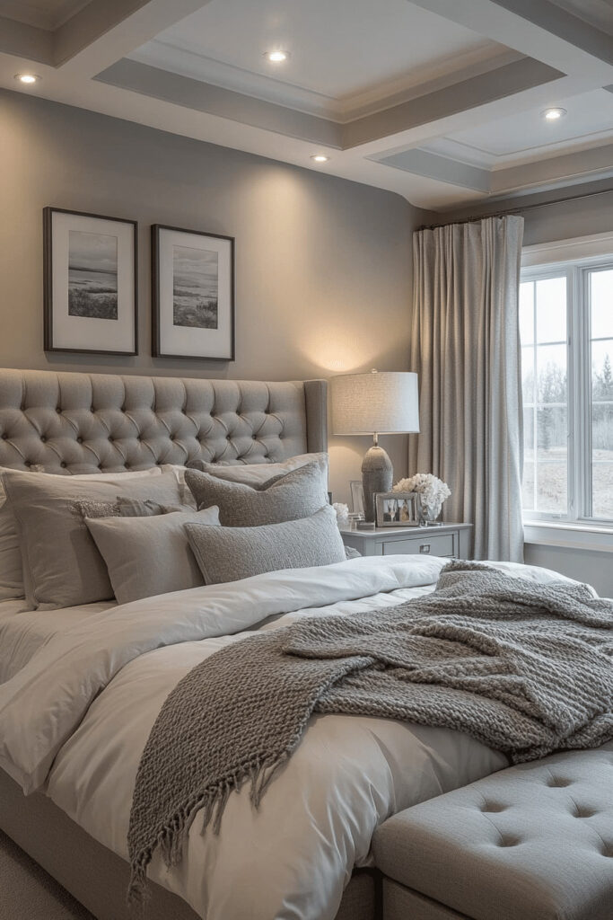 Use the sophisticated, cool tones of slate gray for a modern take on a cozy neutral bedroom. The deep gray is beautifully warmed by soft lighting from table lamps and complemented by silver or chrome accents that add a touch of refinement. Even with a cooler color, the room remains comfortable and inviting with the addition of plush textiles like a velvet comforter or a wool area rug.