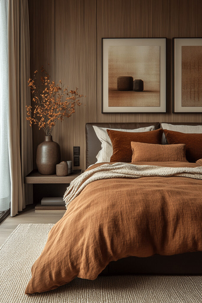 Incorporate the deep, rich tones of umber to create an earthy and grounded bedroom. The deep, warm brown colors provide a wonderful sense of security and comfort, making the room feel like a safe haven. Minimalistic furniture with clean lines emphasizes the room’s spaciousness. Soft, diffused lighting highlights the richness of the umber tones, adding to the room’s incredibly inviting and undisturbed quality.