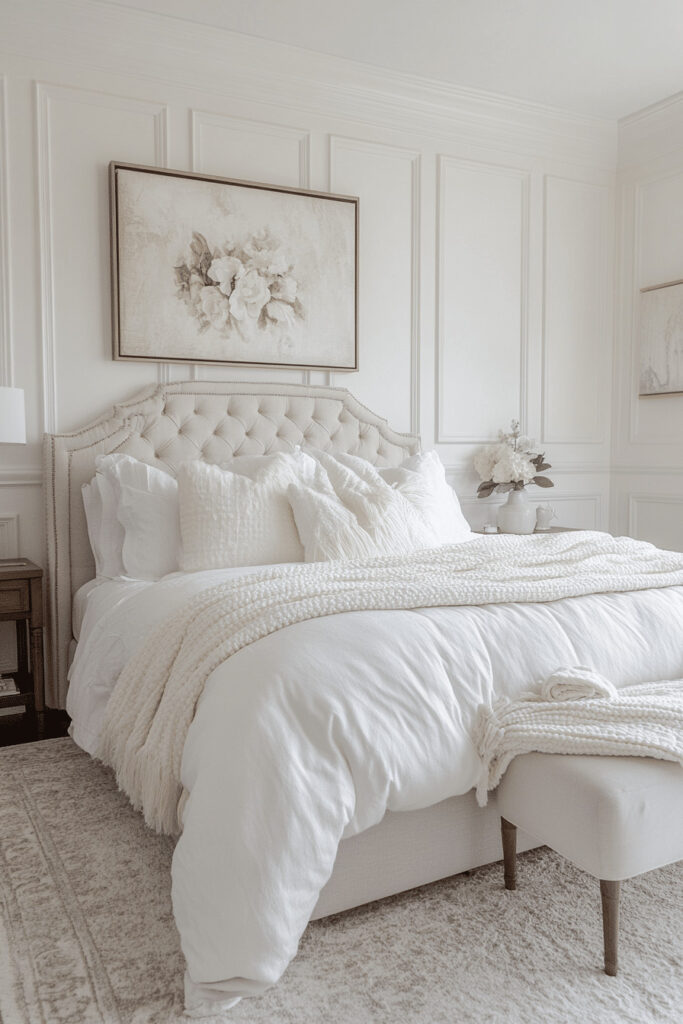 A pure white bedroom can be the ultimate oasis of cleanliness and simplicity. To keep this stark palette from feeling cold, the key is to introduce an abundance of soft textures and cozy fabrics. A fluffy white duvet, a deep-pile shag rug, and knitted pillows create a balanced and restful space that feels both pristine and inviting. Sleek, functional furniture complements the minimalist theme, while strategic warm lighting adds depth and prevents the room from feeling sterile.