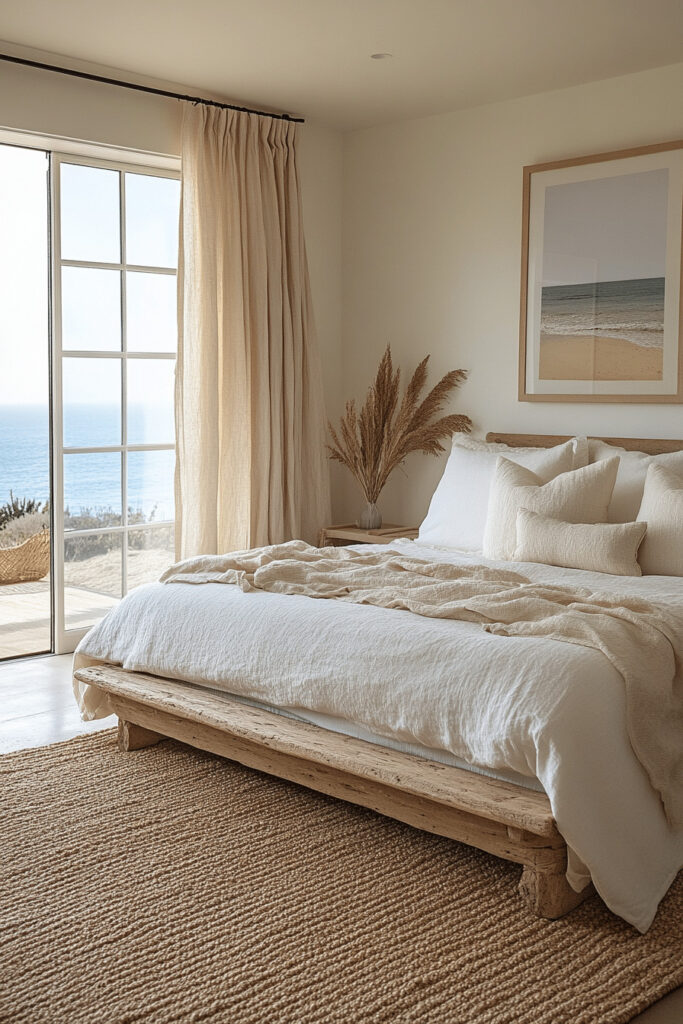 Create a bright, airy, and calming bedroom by using a palette of light sand colors. These soft, warm hues are wonderful for reflecting natural light, which immediately enhances the sense of space and openness. Comfortable, plush furniture invites you to sit back and relax, while simple, minimalistic decor maintains a serene, clutter-free environment. Add extra comfort with natural textures like a soft wool throw blanket or cotton bedding, creating your own serene, beach-inspired escape.