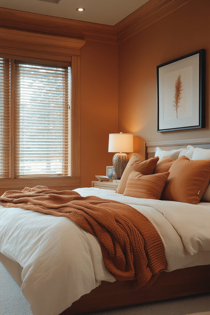 Utilize the warm, earthy tones of clay to craft a bedroom that feels both grounded and serene. This beautiful terracotta-inspired palette is perfectly complemented by other natural materials, like a raw wood bench or soft cotton bedding, which enhances the room’s organic feel. Keep decor minimal and lines clean to maintain focus on the warmth of the clay colors. Comfortable furnishings ensure this corner of your home is inviting and relaxing.