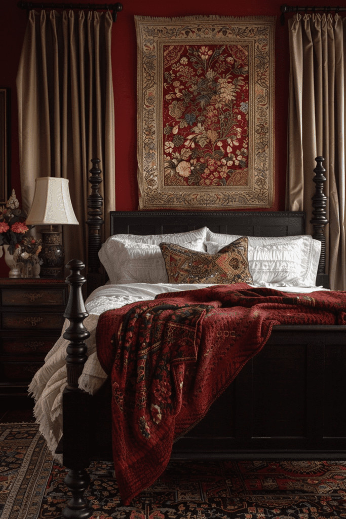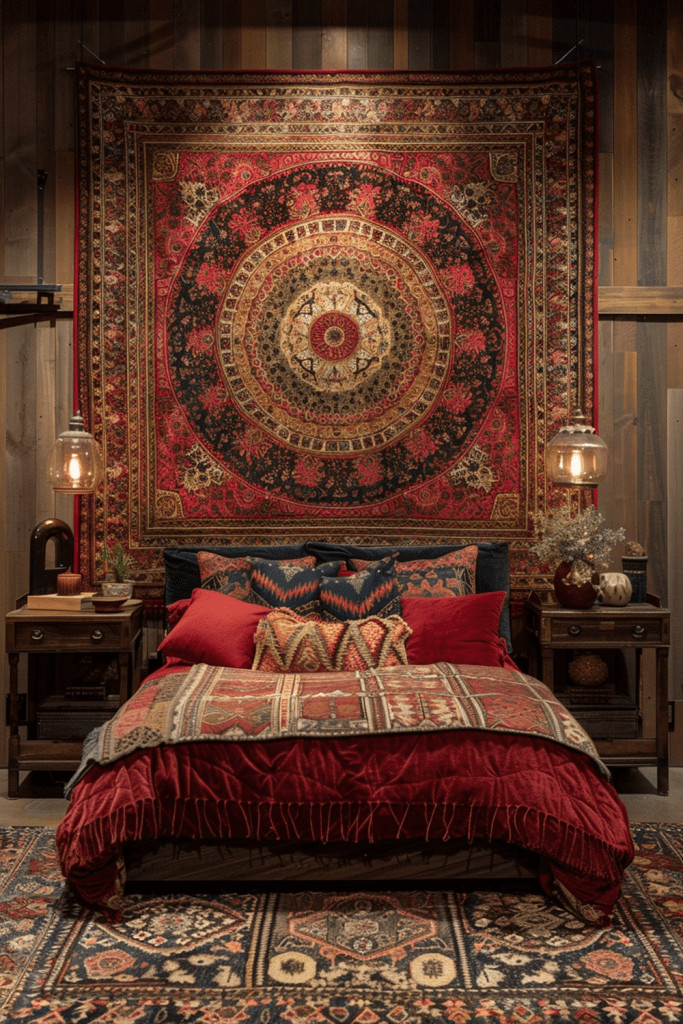 Go all-in on the bohemian aesthetic by adorning your bedroom walls with vibrant, gypsy-inspired red tapestries. Choose pieces that feature exotic patterns, colorful motifs, tassels, and even mirror work. This bold decor choice can transform the entire space into a vibrant and expressive territory that is full of life, culture, and free-spirited energy. Layering multiple tapestries and textiles will enhance the eclectic, well-traveled feel, creating a room that is a true celebration of global art and nomadic style.