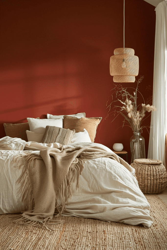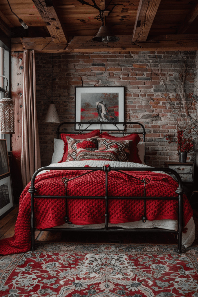 Integrate rustic, deep red textiles to add incredible depth, texture, and warmth to your boho bedroom. Think of a chunky, hand-woven rug in a faded red, a heavy throw blanket with tassels, or cushions made from coarse, rustic linen. These deep red tones pair beautifully with natural wood furniture, woven seagrass baskets, and other organic materials. This creates a grounded, earthy environment that feels both incredibly cozy and connected to nature, perfect for a bedroom that serves as a true haven from the outside world.
