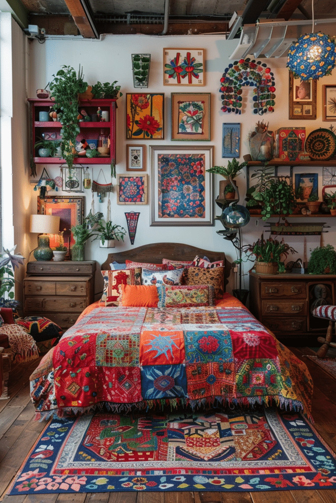 For a more playful, colorful, and creative boho vibe, blend cheerful poppy red patchwork into your bedroom decor. A bright, handmade patchwork quilt on the bed or a collection of mismatched patchwork pillows can bring an immediate sense of lively, artistic energy to the room. This cheerful and homespun approach celebrates color and craftsmanship. It’s a perfect way to create a space that feels vibrant, full of life, and reflective of a creative, free-spirited personality, turning your room into a true paradise of pattern.