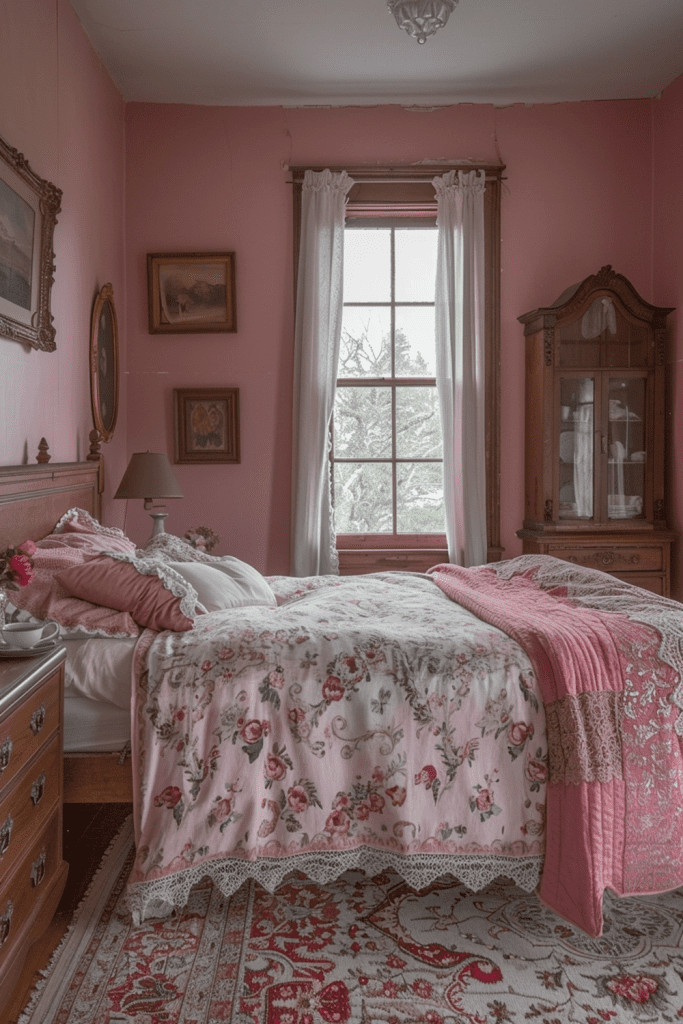 For a more nostalgic, gentle, and romantic boho bedroom, decorate with the soft, dusty hues of antique rose. This faded, pinkish-red is beautifully complemented by vintage floral patterns and soft, delicate fabrics like worn linen and lace. Enhance the timeless beauty of this color scheme by incorporating antique furniture, perhaps a distressed white dresser or a vintage mirror with a tarnished frame. This creates a deeply romantic and peaceful space that feels like a cherished discovery from a bygone era.