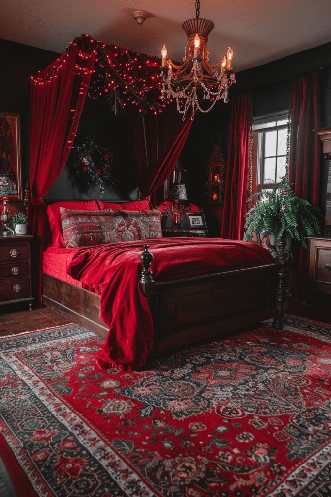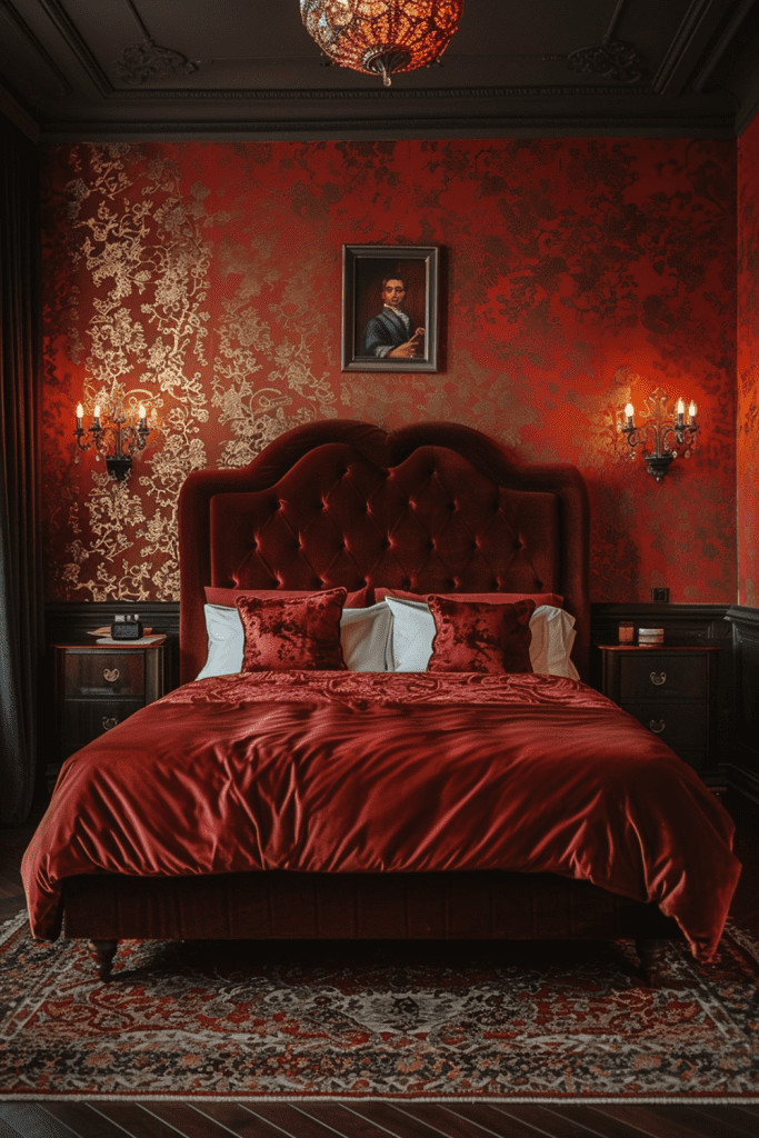 Create a deeply comfortable and sophisticated escape with the plush, tactile beauty of red velvet. Introducing lush red velvet cushions, a statement headboard, or heavy, light-absorbing curtains can instantly add a touch of luxury and comfort. The plush texture of velvet invites touch and relaxation, while the deep red hues make the bedroom a perfect, cocoon-like space to relax and rejuvenate. This is an ideal way to make your room feel both incredibly cozy and undeniably chic, blending comfort with high style.