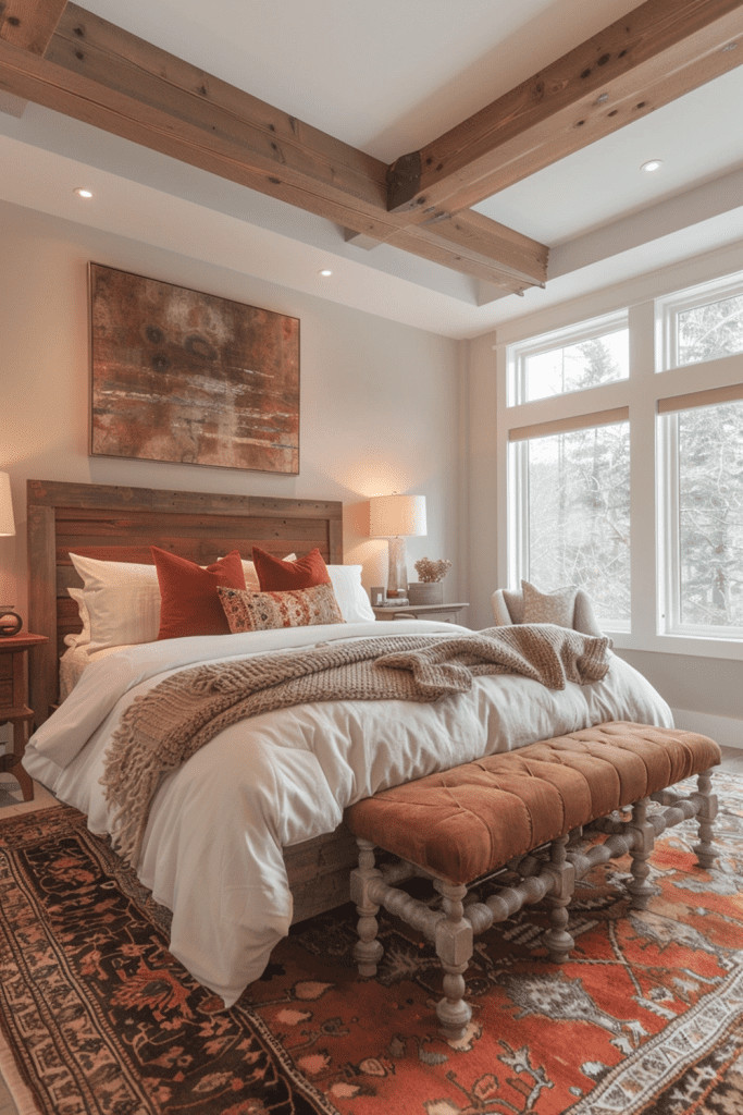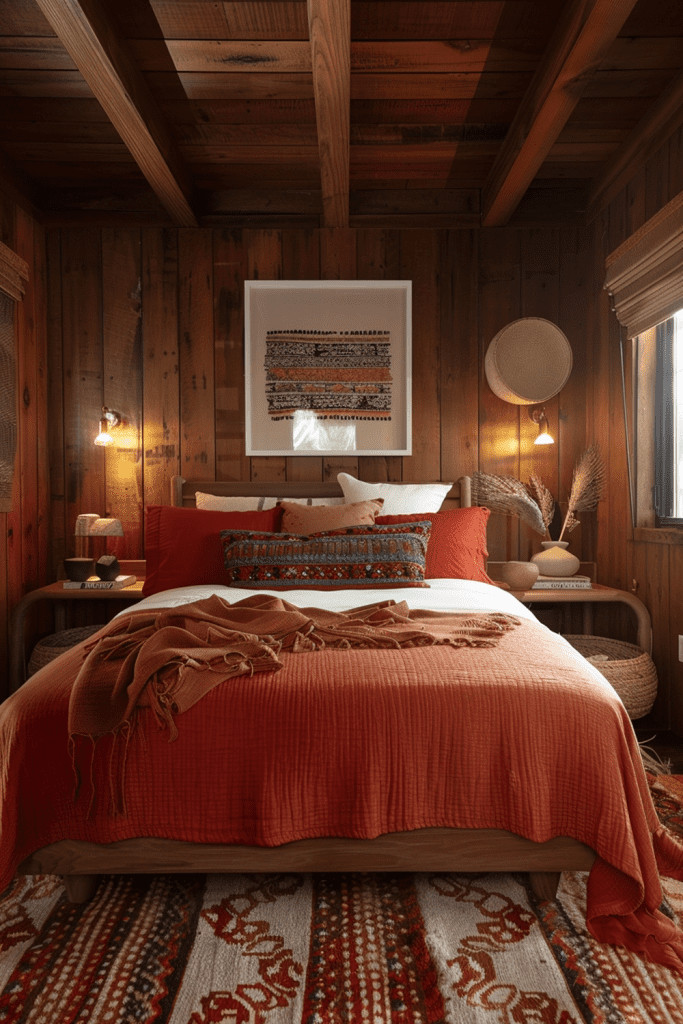 Craft a restful and grounding boho respite by integrating the deep, earthy tones of redwood with softer red fabrics. Use natural redwood for an accent wall, a headboard, or simple, solid furniture. The natural wood elements bring an incredible sense of warmth and tranquility to the bedroom. Complement this with comforting shades of red in your bedding and rugs to create a cohesive, nature-inspired palette. This design feels like a peaceful retreat into a quiet, sun-dappled forest, perfect for rest and rejuvenation.