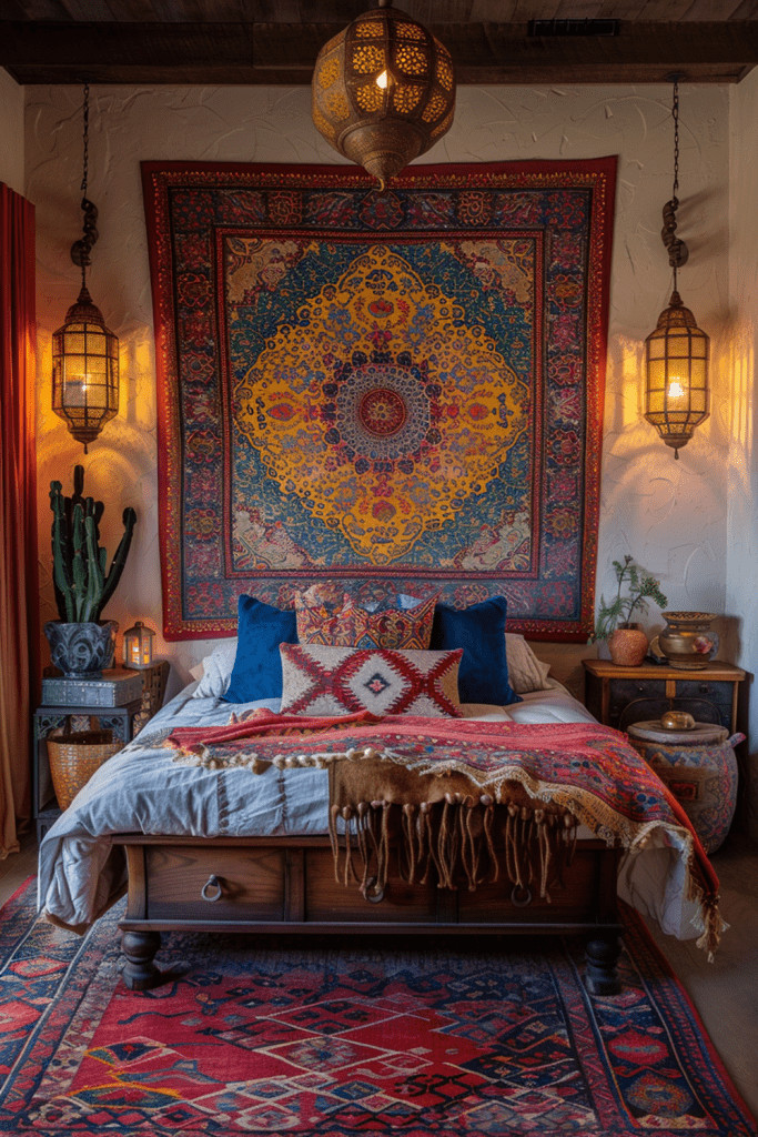 Craft a majestic and exotic boho bedroom by incorporating the vibrant reds and intricate patterns of Moroccan design. Use a rich, spicy Moroccan red as a base color for walls or a large area rug. Layer in luxurious textures with silk pillows, leather poufs, and plush wool blankets. No Moroccan-inspired room is complete without ornate metal lanterns that cast intricate patterns of light and shadow. This combination of color, pattern, and texture will enhance the exotic appeal and transport you to a majestic foreign land.