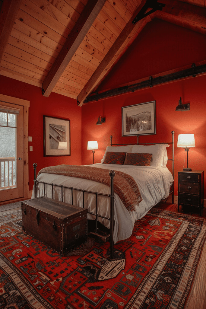 If you have an attic bedroom with sloped ceilings, embrace the cozy, enclosed feeling by painting it in a vibrant vermilion red. This bold choice can turn the space into a dramatic, vault-like retreat that feels both incredibly cozy and full of energy. To prevent the vivid color from being overwhelming, complement the walls with contrasting light-colored textiles for your bedding and rugs. Add eclectic decor to complete the look, creating a unique and powerful space with immense character.