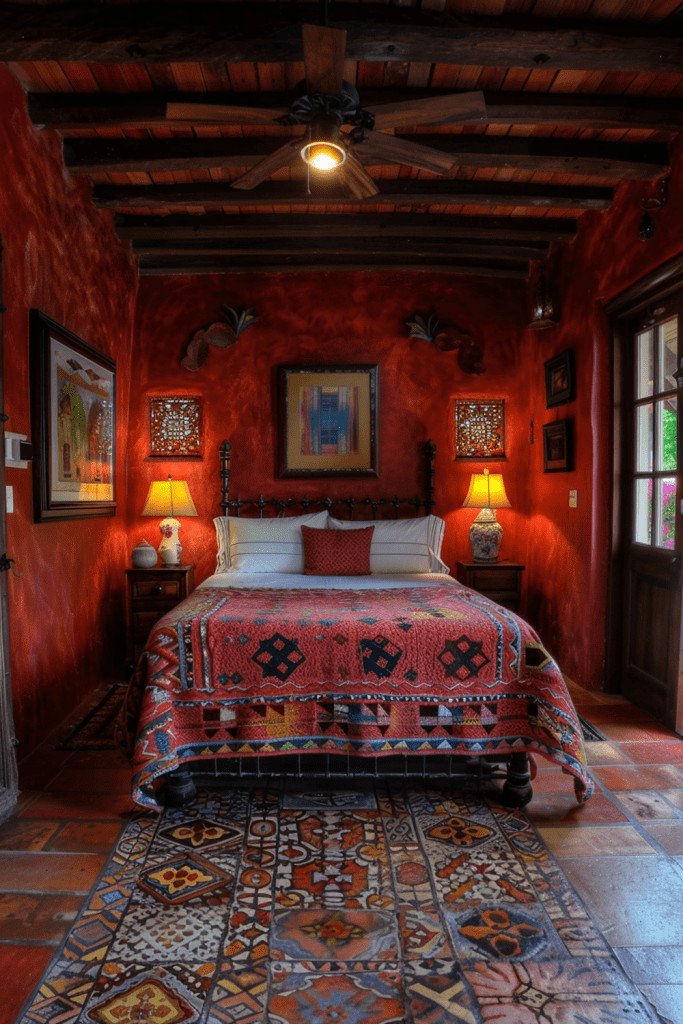 Design a warm and passionate carmine-colored casita with Spanish or Mexican boho influences. This deep, rich red, similar to cochineal dye, evokes a sense of warmth and history. Incorporate elements like rustic terracotta floor tiles (or a rug that mimics them), wrought iron details in a bed frame or curtain rods, and textiles with vibrant, folk-art-inspired patterns. This themed bedroom retreat is full of character, passion, and a sun-baked, rustic charm that feels both exotic and deeply comforting.