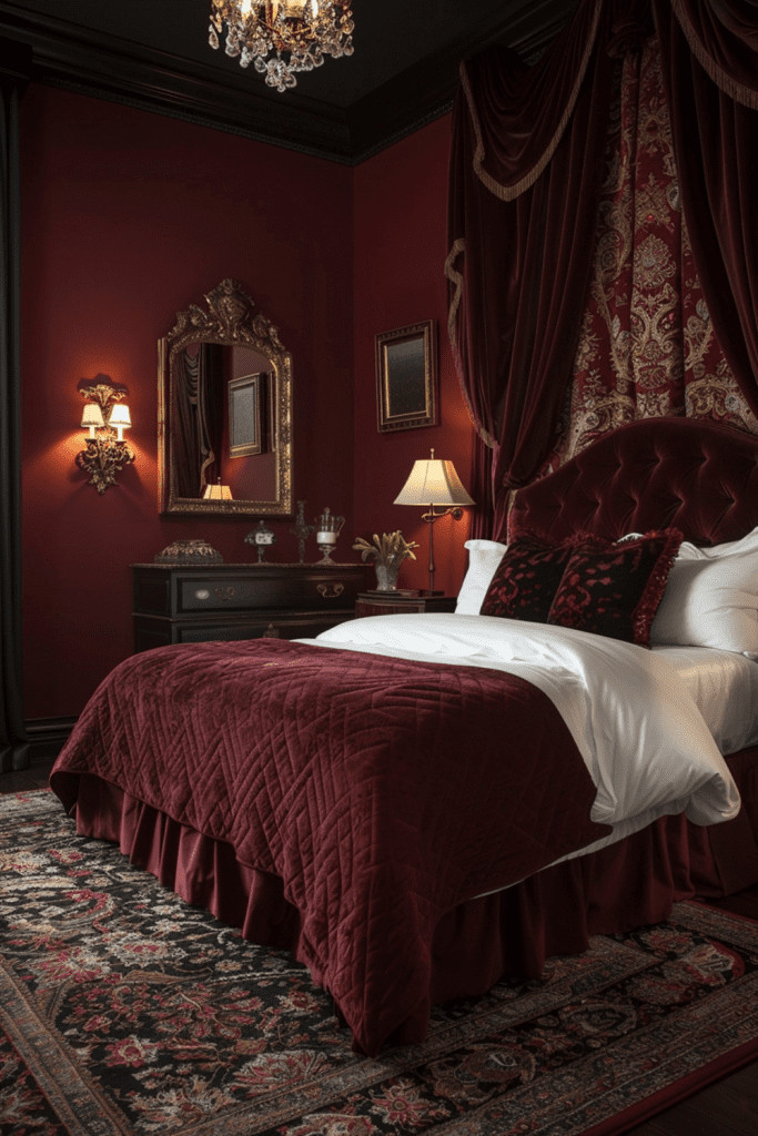 Design a bedroom that is imbued with a sense of mystique, elegance, and drama by using deep maroon on the walls. This rich, dark color creates a cozy, enveloping feel. Pair it with glamorous gold accents in your decor, such as a gold-framed mirror or brass light fixtures, to add a touch of sophisticated elegance. This powerful color combination works exceptionally well with dim, moody lighting from shaded lamps or candles, creating a mysterious and incredibly inviting space perfect for a dramatic and intimate retreat.