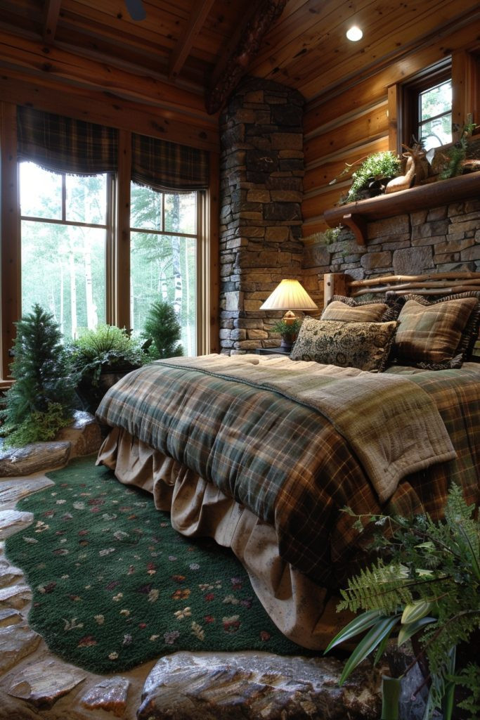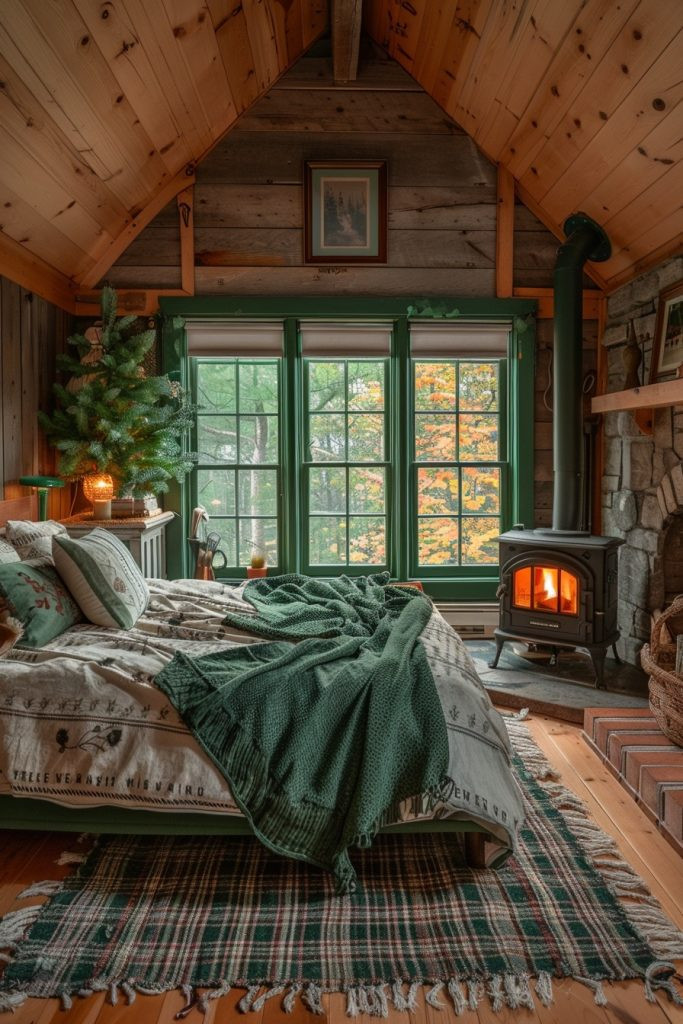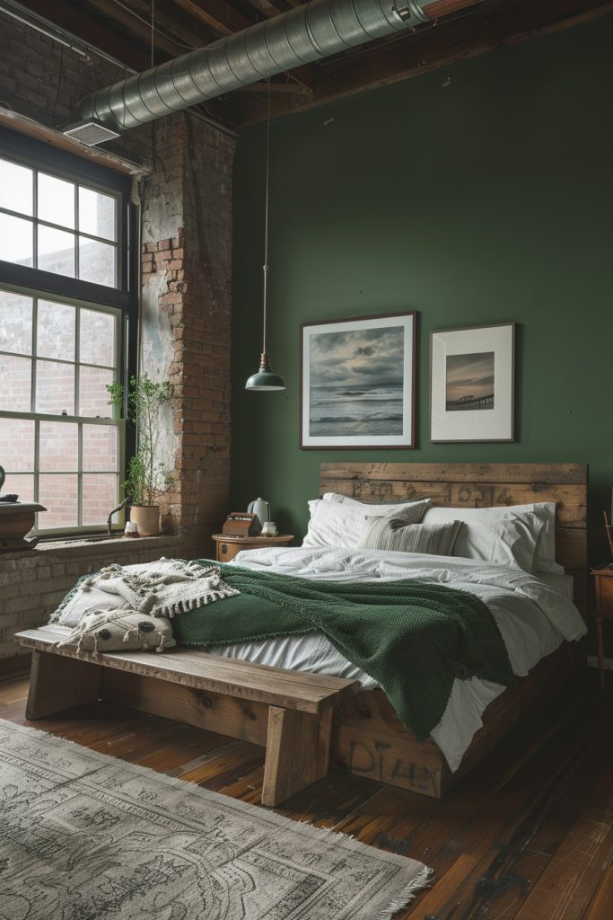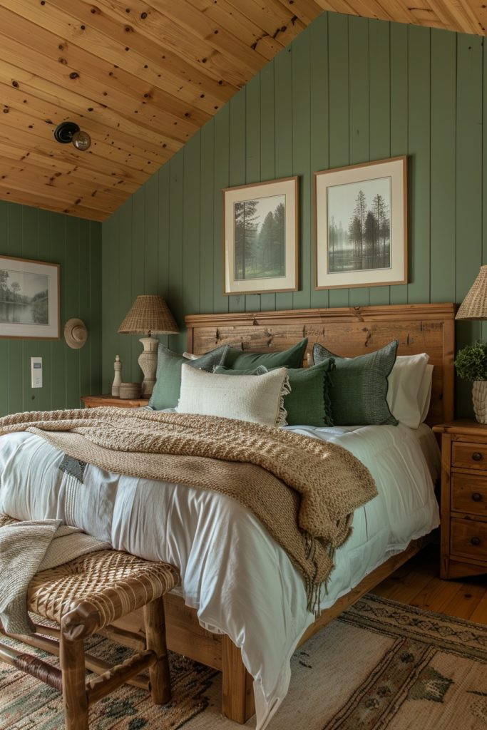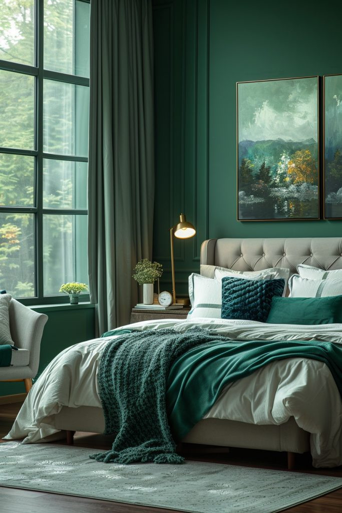 Evoke the crisp, refreshing feeling of a mountain lodge by using a classic pine green. This shade of dark green has a cool undertone that feels both clean and invigorating. It is the perfect color for creating a cozy yet refined atmosphere. This color works exceptionally well with rustic wooden furniture, plaid textiles, and warm, ambient lighting from shaded lamps. This combination creates a sense of coziness and timeless charm, making your bedroom feel like a welcoming haven tucked away in the mountains.