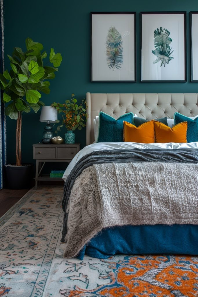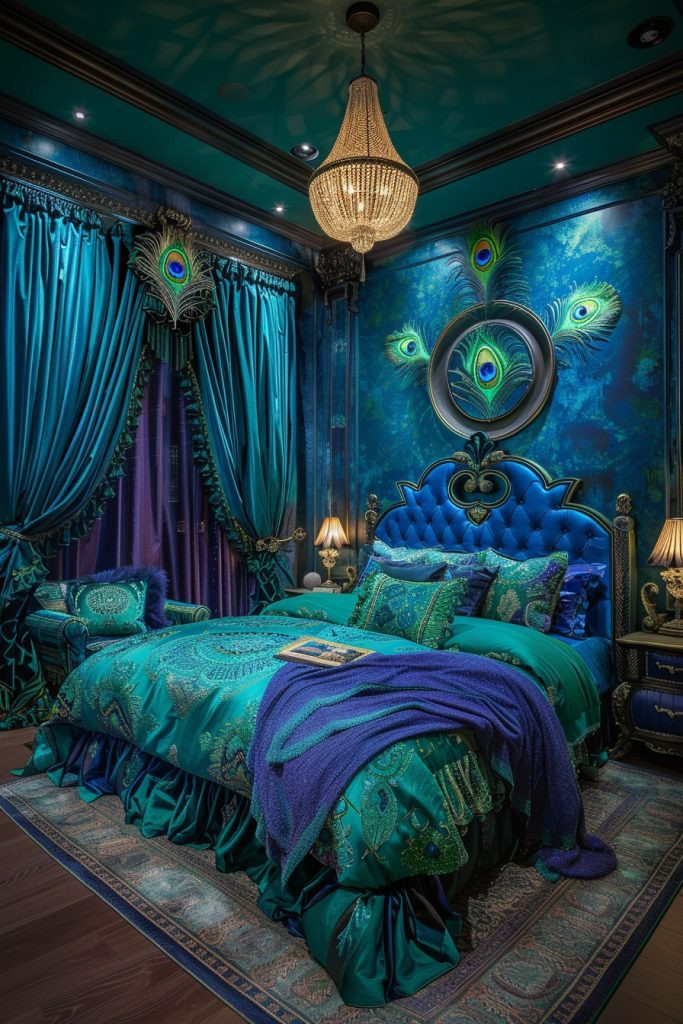 Utilize the rich, vibrant, and iridescent tones of peacock feathers to add a splash of extravagant luxury to your bedroom. This theme is built on a foundation of deep, jewel-toned green, layered with accents of sapphire blue, amethyst purple, and shimmering gold. Use these colors in your textiles, such as a velvet bedspread or silk cushions. The result is an opulent, dramatic, and incredibly inviting space that is full of depth and personality.