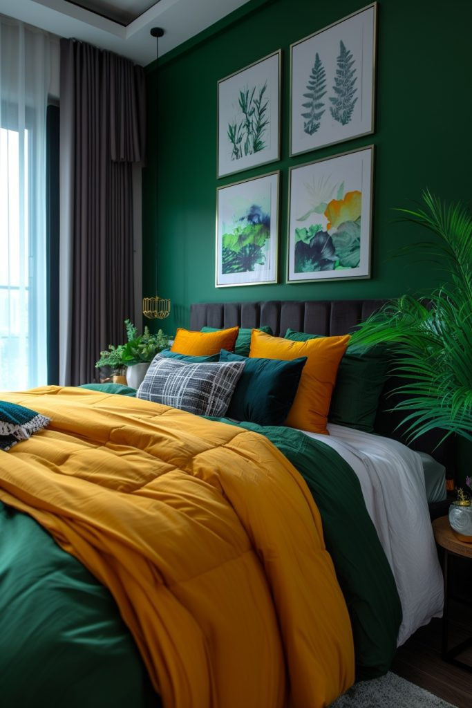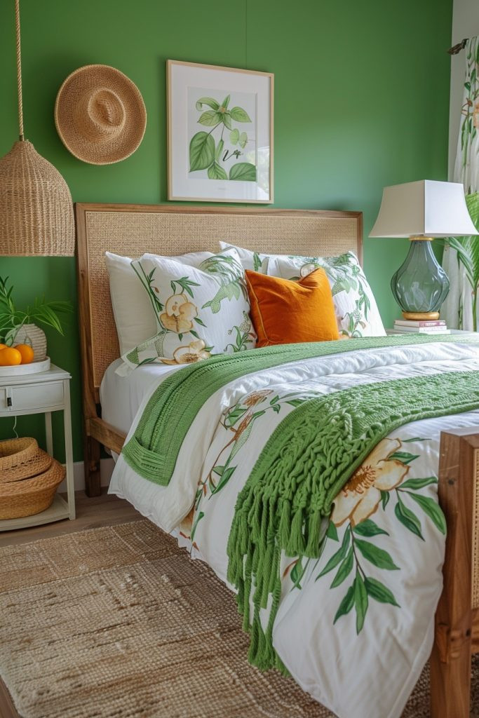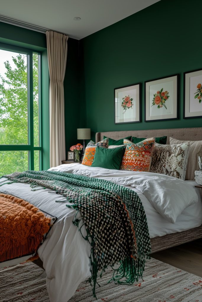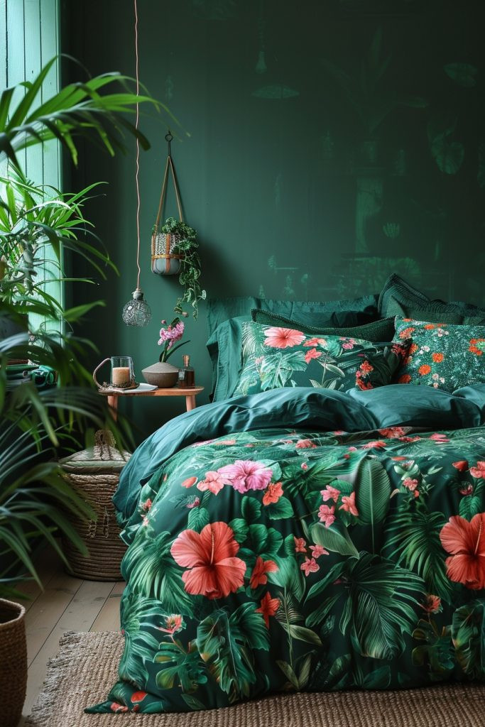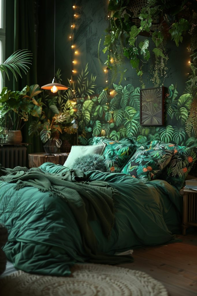Use a vibrant, saturated dark green to create a lively tropical oasis in your own bedroom. This theme invites a sense of adventure and ultimate relaxation. Complement the rich green walls with bold, large-scale floral or palm-leaf prints on your wallpaper, bedding, or artwork. Incorporate exotic accents like rattan furniture, bamboo details, and decor made from natural fibers. This design choice transforms your bedroom into a personal getaway, making every day feel like a vacation in a lush, exotic paradise.
