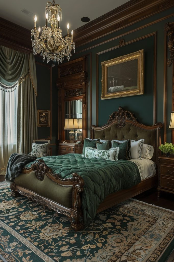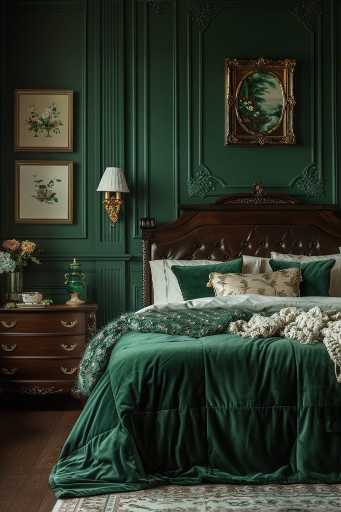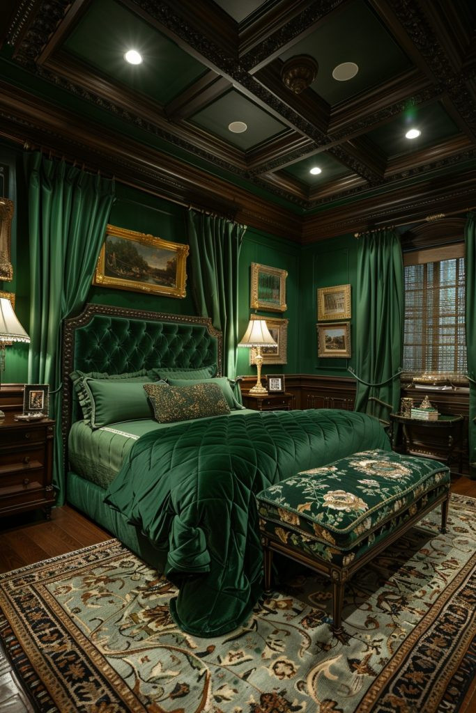 Channel pure opulence by decorating your bedroom in the rich, jewel-toned shade of emerald green. This color exudes a sense of depth and history, instantly creating a luxurious retreat. To amplify the regal atmosphere, pair emerald walls with accents in brushed gold or polished brass. Imagine how warm light from a golden chandelier or bedside lamps would glint off the metallic finishes, making the deep green glow. Complete the look with sumptuous textiles like a velvet headboard or silk throw pillows to create a sanctuary that feels both magnificent and deeply comforting.